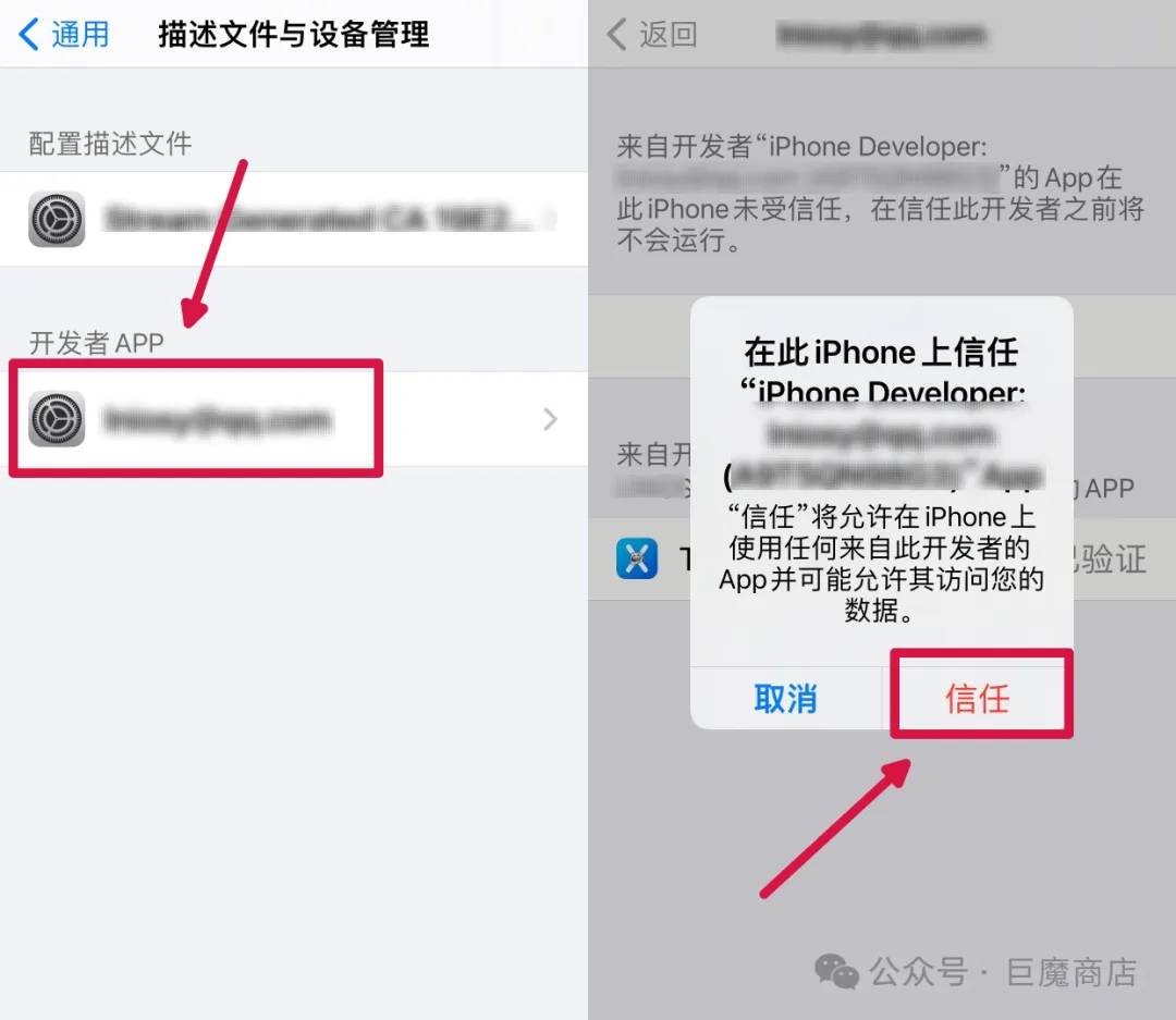 安装签名好之后,接着我们来到手机设置 - 通用 - 设备管理,找到这个不受信任的信息,点击信任即可。