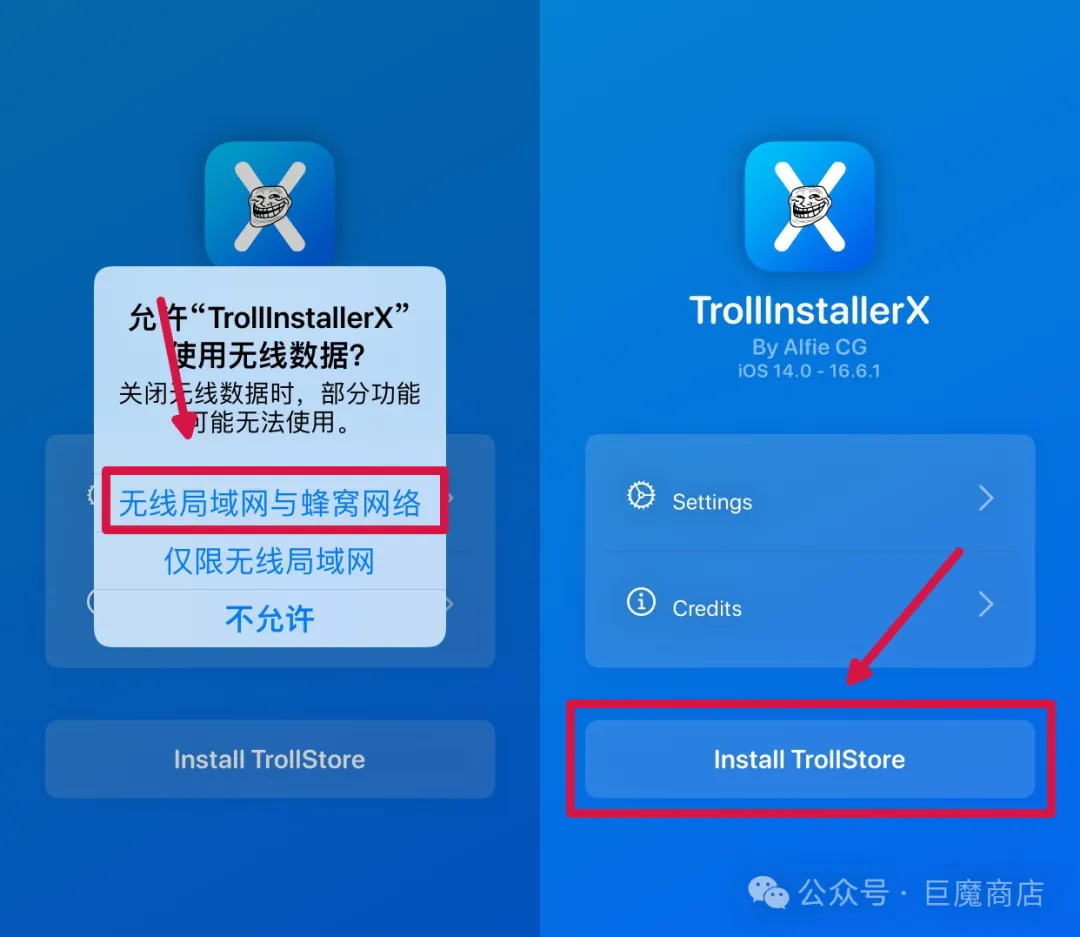 信任之后,我们就可以成功打开TrolllnstallerX安装器了,这边我们首先允许使用网络,然后再点击下方的【安装】按钮。