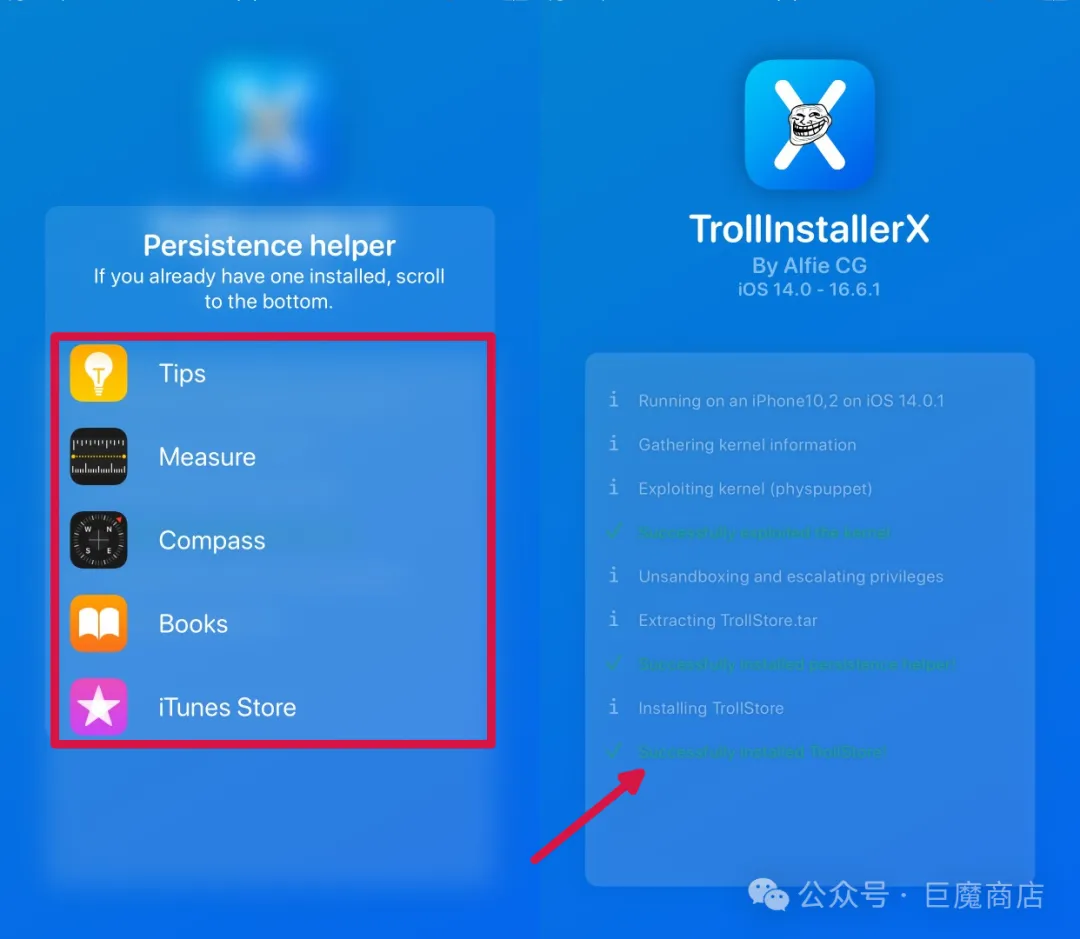 安装的时候这边还会提示让你选择一个 “注入永久性助手”,这里咱们选择一个自己不常用的即可,后面巨魔出问题我们重新安装的话,直接用这个注入过的app安装即可。