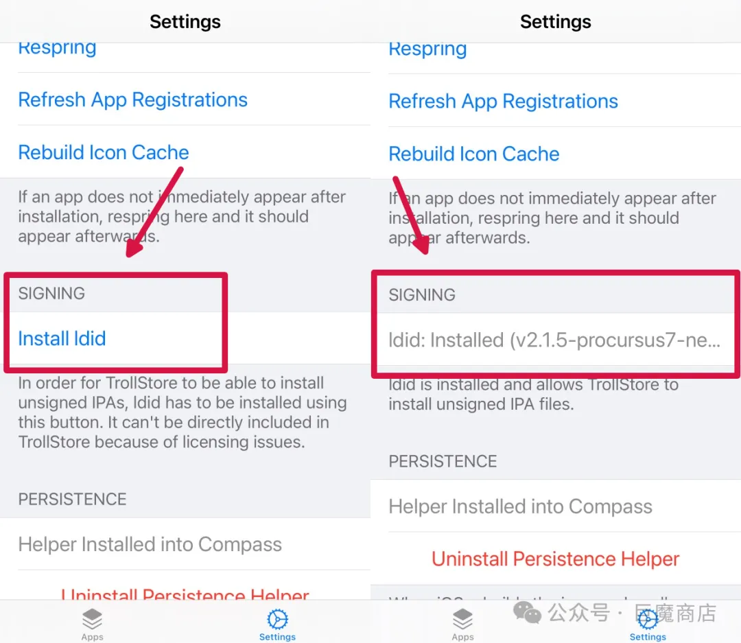注意:如果首次打开没有弹出自动安装 ldid,请在设置中点击 Install ldid 进行手动安装。