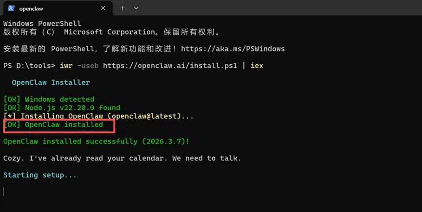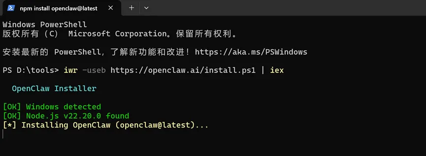 复制以下整行命令,粘贴到 PowerShell 中按回车:iwr -useb https://openclaw.ai/install.ps1 | iex
