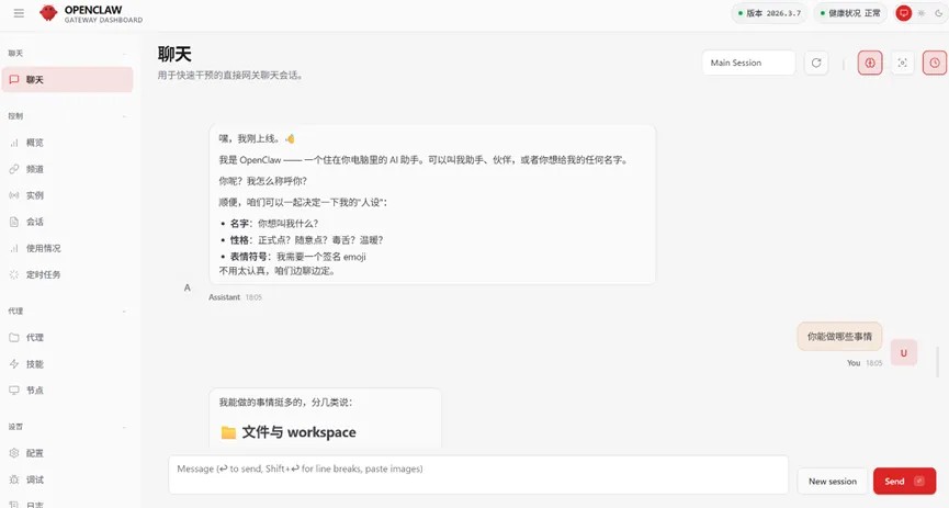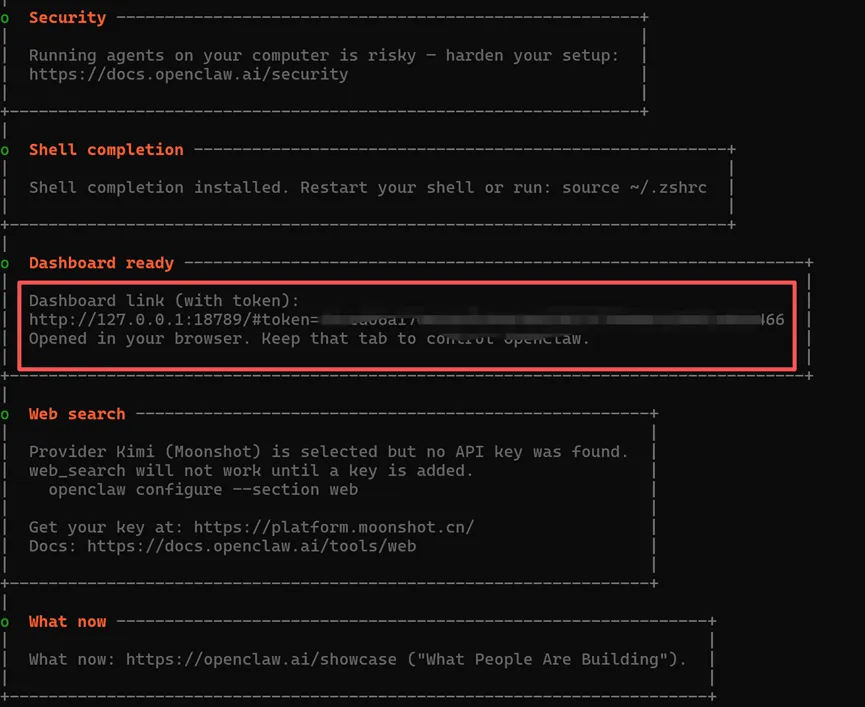 复制红框中的地址(通常是 http://localhost:18789/#tokem=xxxx)到浏览器打开,或直接点击自动打开的页面。