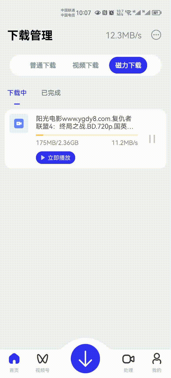 打开石兹 力下载功能,粘贴链接开始下载,下载的速度还是非常快的,高速能达到10多M一秒,低速也有5M这样,而且还支持边下边播。