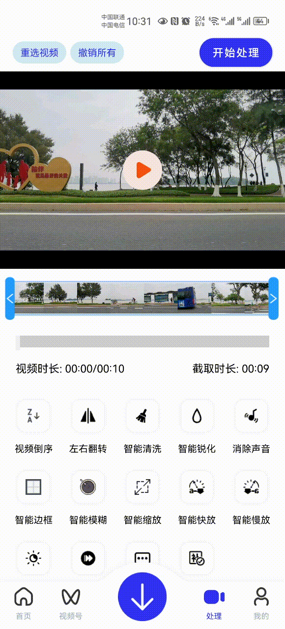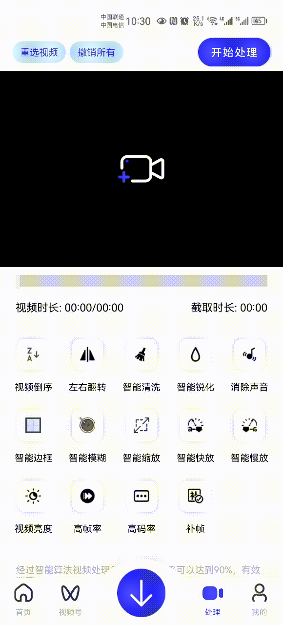 软件内还有一个视频处理工具,有用裁剪、倒放、消除原声、智能锐化、智能边框、视频亮度、补帧、快放、慢放等功能。