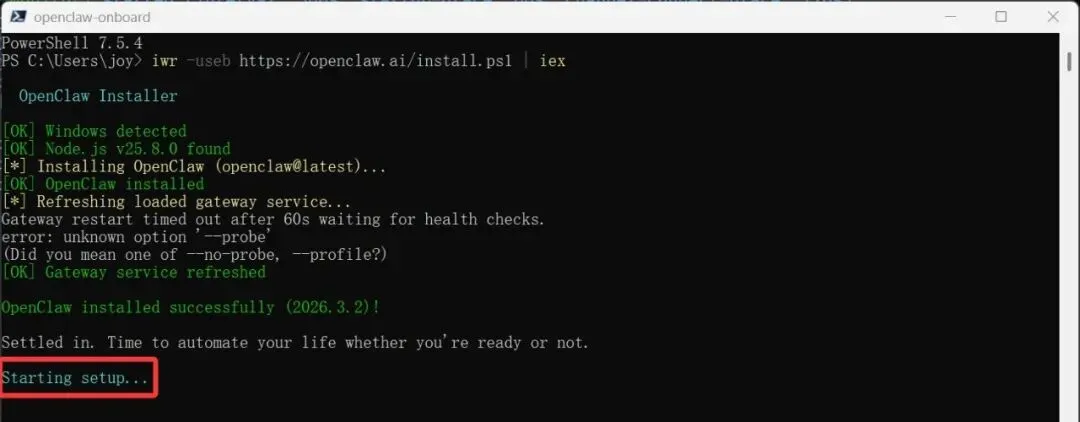 官方一键安装代码:iwr -useb https://openclaw.ai/install.ps1 | iex