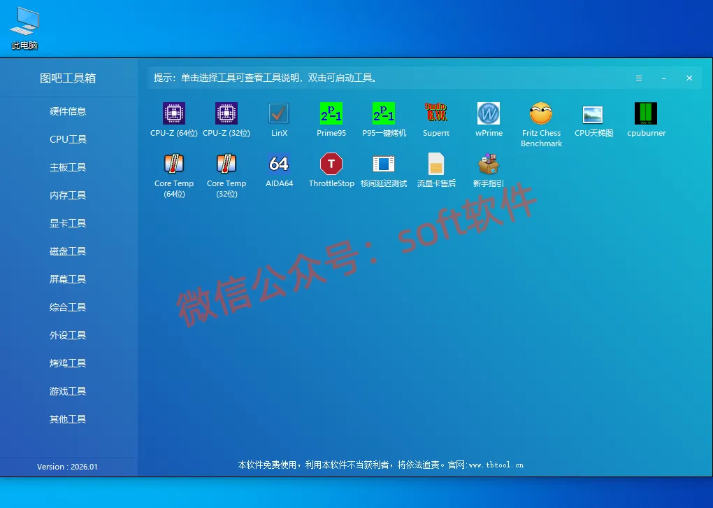 图吧工具箱是一款集成化硬件检测工具合集,主要功能包括硬件信息采集、性能测试、故障诊断、系统优化和外设检测等。