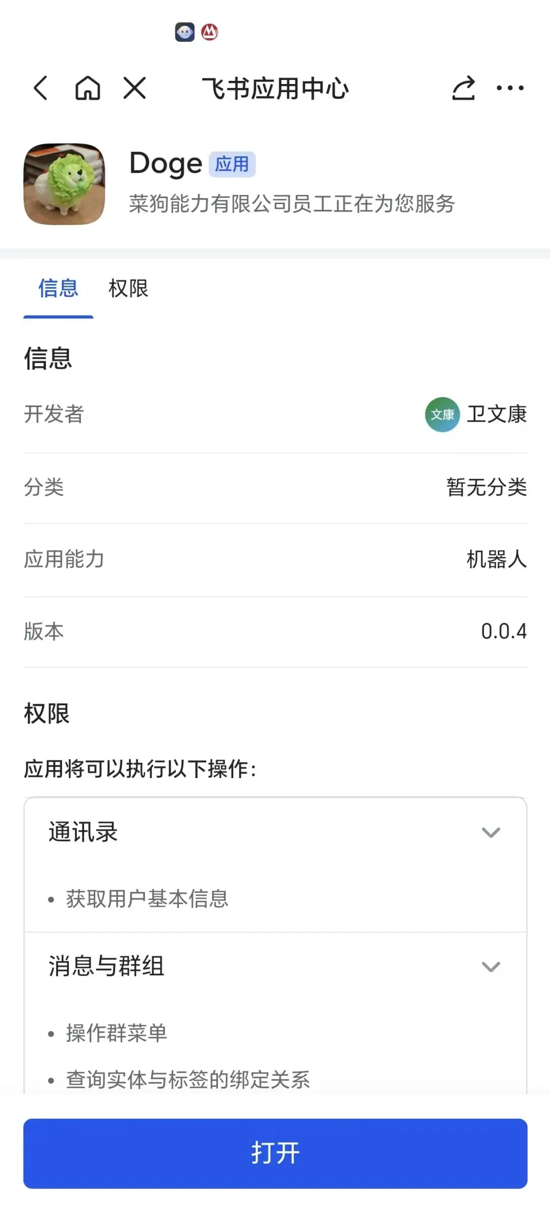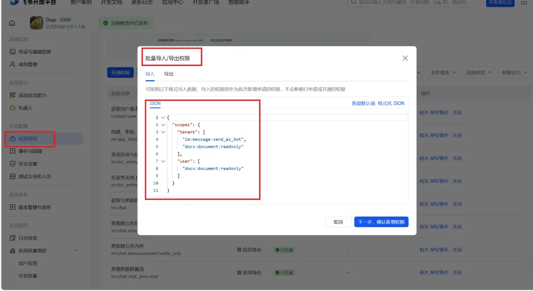 { "scopes": { "tenant": [ "contact:user.base:readonly", "im:chat", "im:chat:read", "im:chat:update", "im:message", "im:message.group_at_msg:readonly", "im:message.p2p_msg:readonly", "im:message:send_as_bot", "im:resource", ], "user": [] } }#Step1 飞书插件安装 openclaw plugins install @m1heng-clawd/feishu # Step2: 配置填写你自己创建的飞书应用的appId 和appSecret 以及 启动feishu插件 openclaw config set channels.feishu.appId "cli_xxxxx" openclaw config set channels.feishu.appSecret "your_app_secret" openclaw config set channels.feishu.enabled true # Step3: 重启服务 openclaw gateway restart