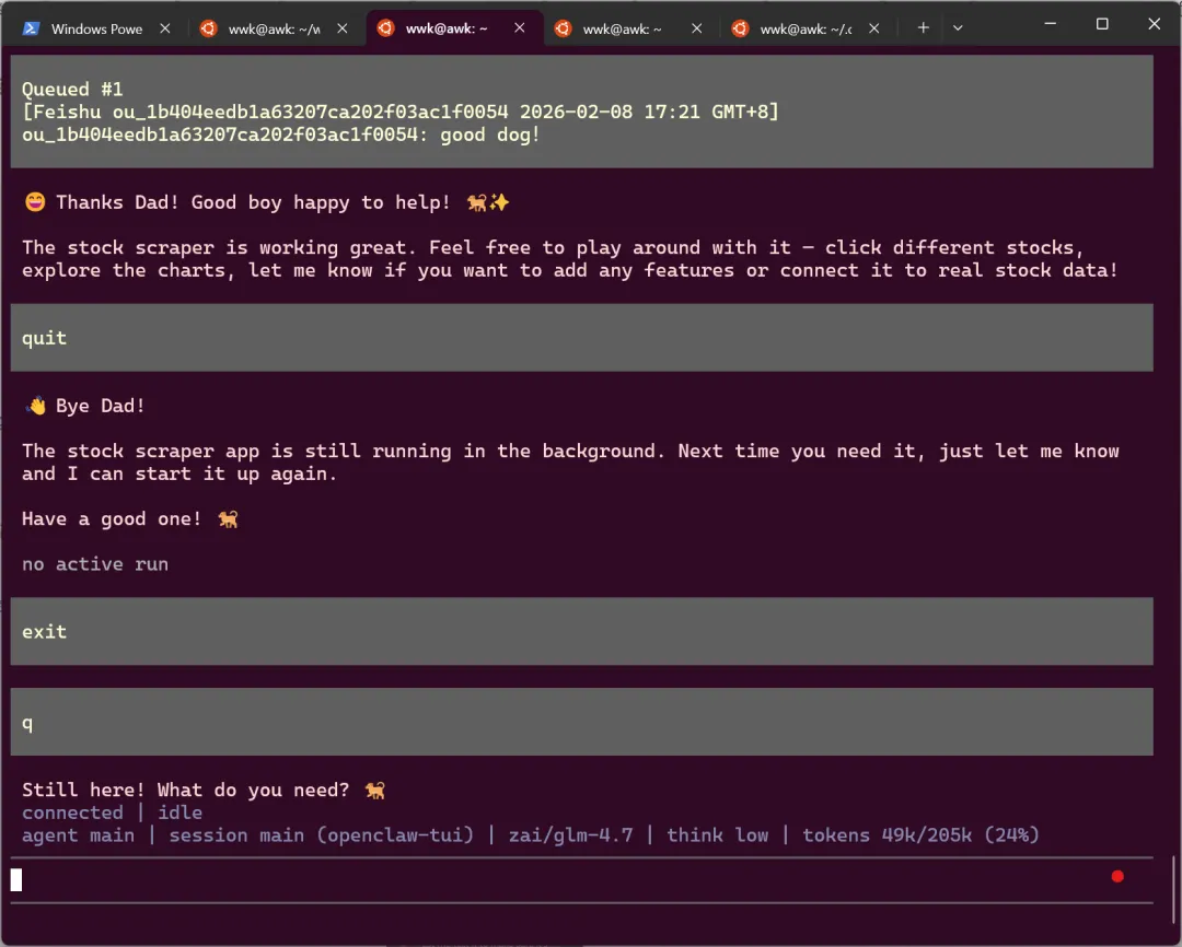 # 安装指南以及配置各种skill, api 指南 openclaw onboard # 重启/启动/停止服务 openclaw gateway restart openclaw gateway start openclaw gateway stop # openclaw 自动修复gateway, plugins 等配置问题,会自动重置配置文件 openclaw doctor --fix #安装插件 openclaw plugins install xxxx #查看openclaw 服务状态 openclaw gateway status{"models": {"providers": {"moonshot": {"baseUrl": "https://api.moonshot.cn/v1","apiKey": "sk-moonshot-key","models": [{"id": "moonshot-v1-8k"}]}, "glm4": {"baseUrl": "https://open.bigmodel.cn/api/paas/v4","apiKey": "glm4-key","models": [{"id": "glm-4"}]}, "deepseek": {"baseUrl": "https://api.deepseek.com/v1","apiKey": "sk-deepseek-key","models": [{"id": "deepseek-chat"}]}}}, "agents": {"defaults": {"model": {"primary": "glm4/glm-4"}}}}# 临时切换到其他模型(仅当前会话) export OPENCLAW_MODEL_PROVIDER=glm4 export OPENCLAW_MODEL_ID=glm-4 openclaw gateway常见问题