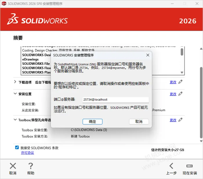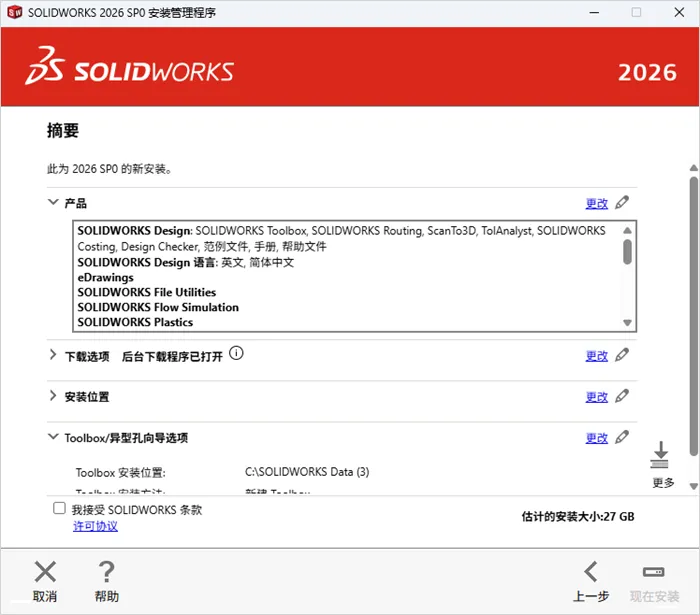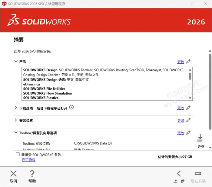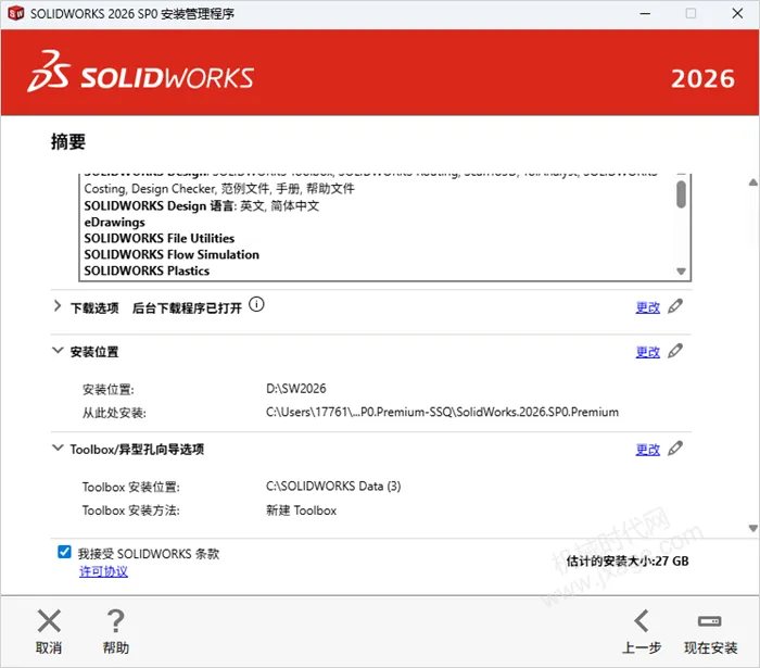 15.勾选左下角的“我接受SOLIDWORKS条款”,然后点击“现在安装”。