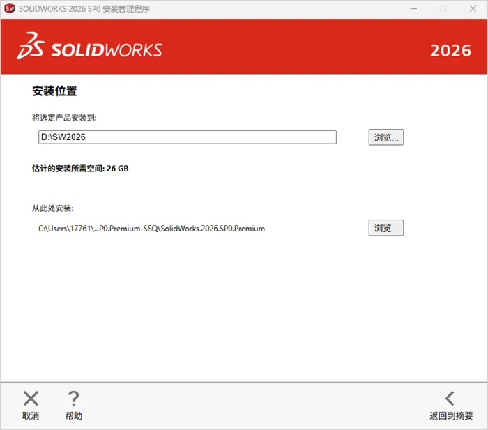 14.点击安装位置右侧的“浏览”按钮,更改软件的安装位置为D:\SW2026,如下图所示,然后点击返回到摘要。