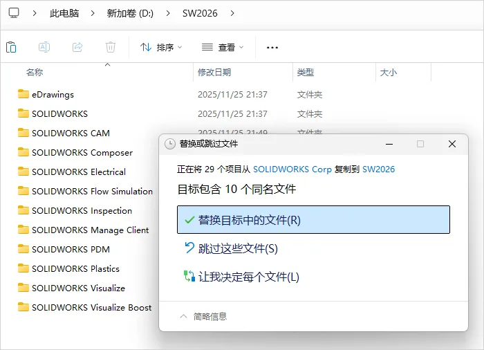 将复制的文件夹粘贴到SOLIDWORKS的安装目录进行覆盖,即D盘的SW2026文件夹,如下图所示。