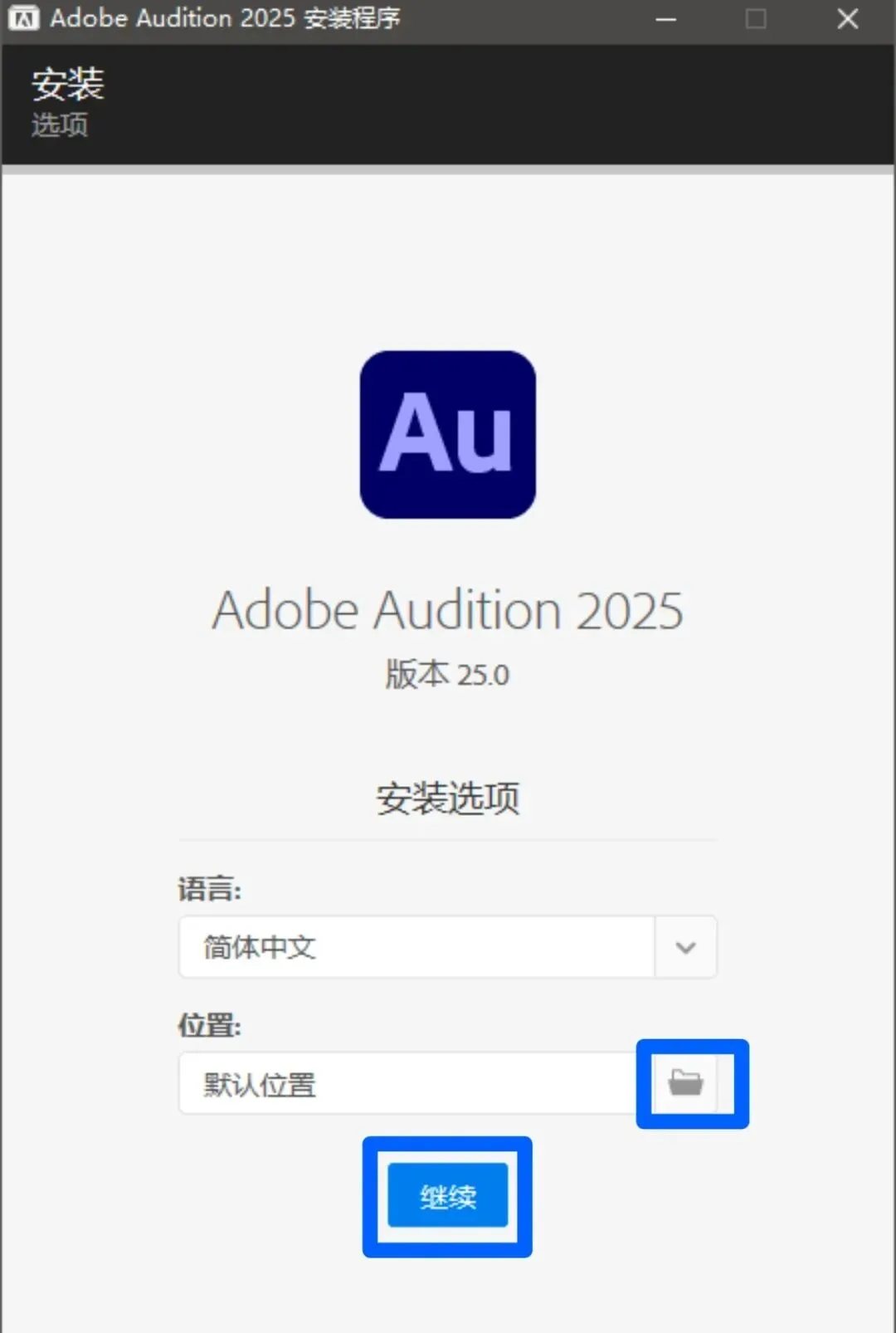 下面的安装教程示范用的软件是Au2025,其余版本安装方法跟这个一样!