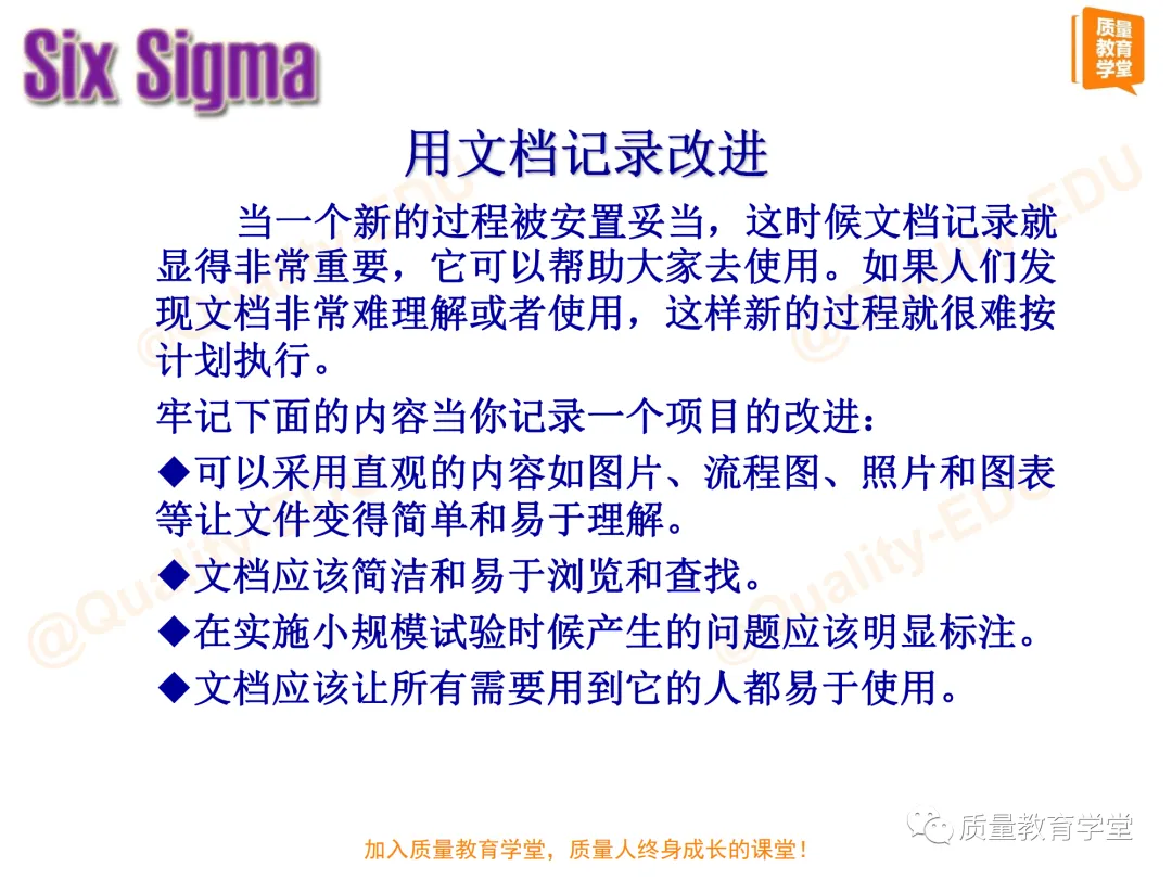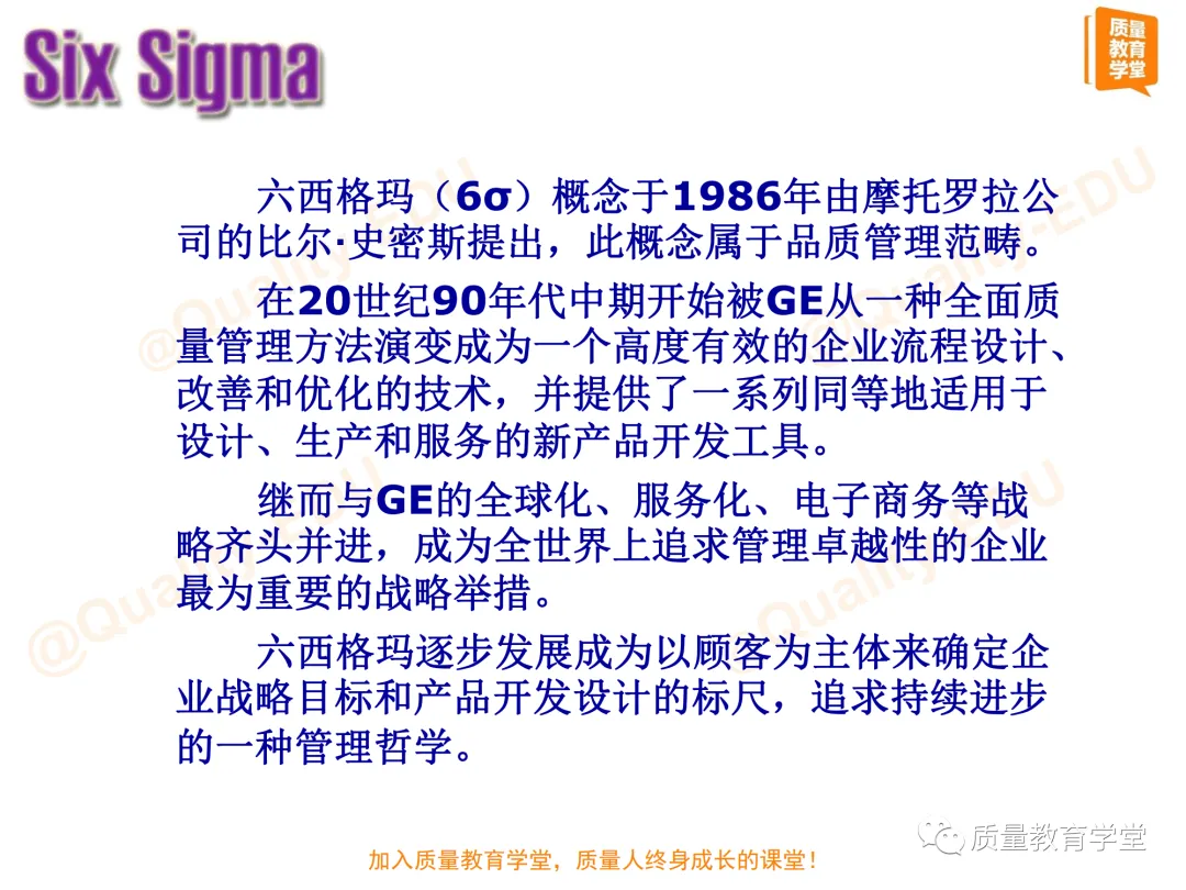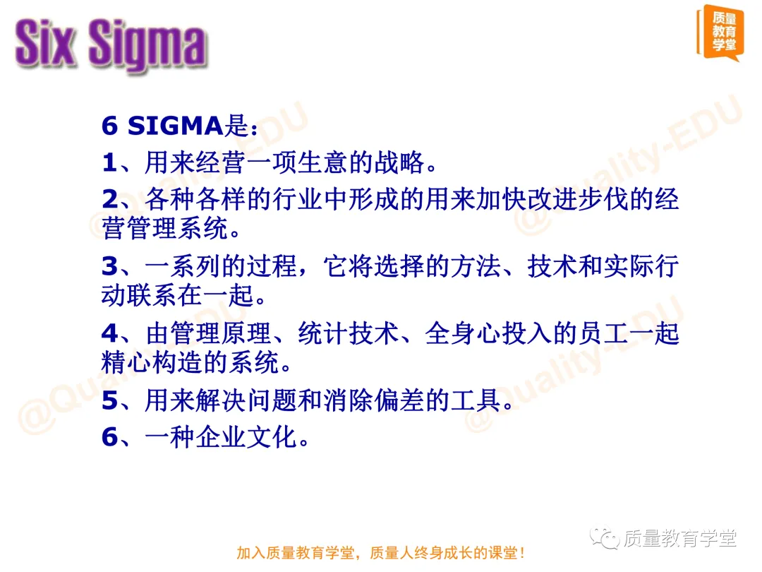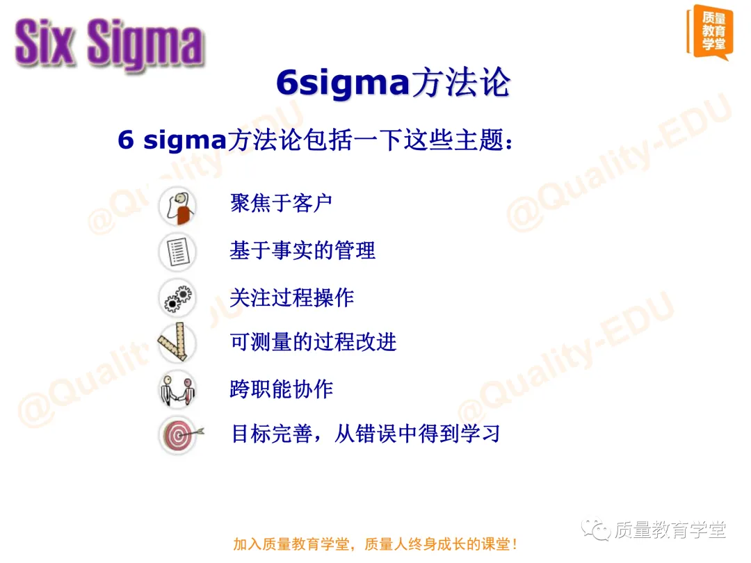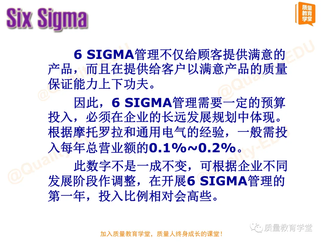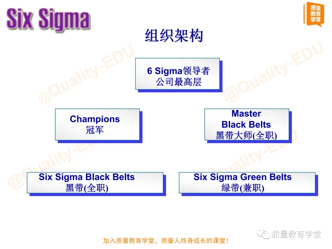 六西格玛以倡导者,大黑带,黑带,绿带体系建立人力资源构架,为企业培养了具备组织能力,激励能力,项目管理技术和数理统计诊断能力的领导者,这些人才是企业适应变革和竞争的核心力量。以保证公司内部持续性。
