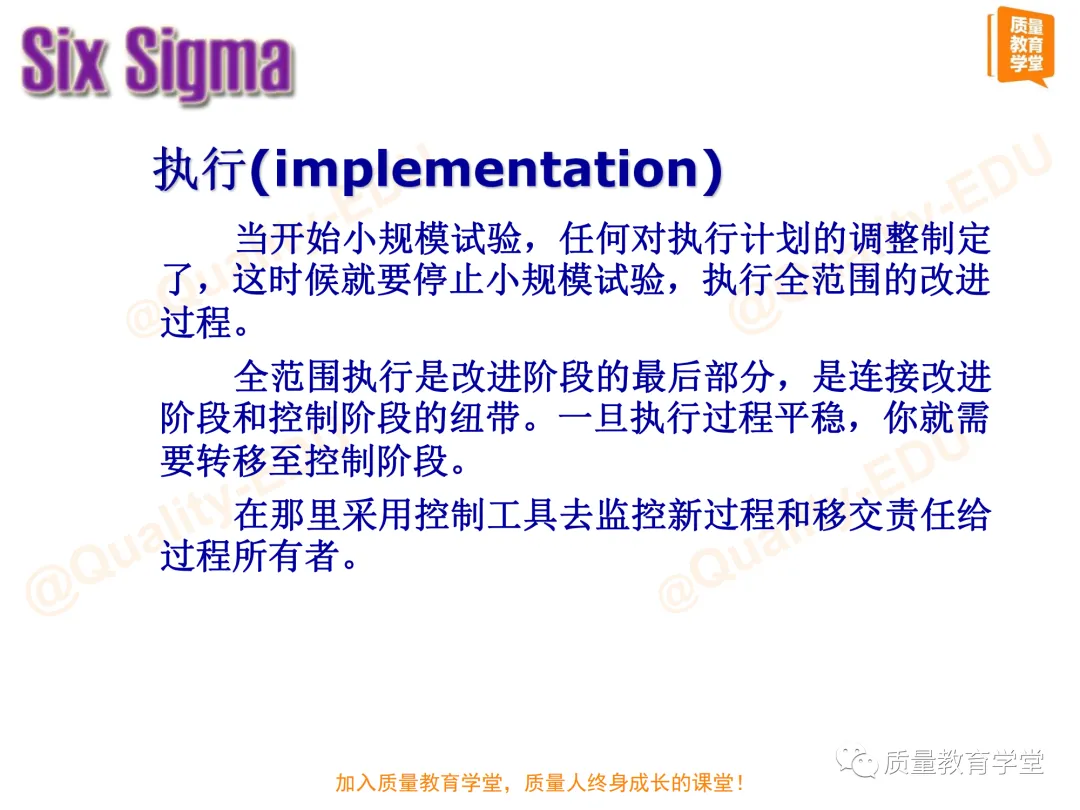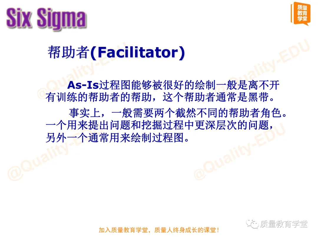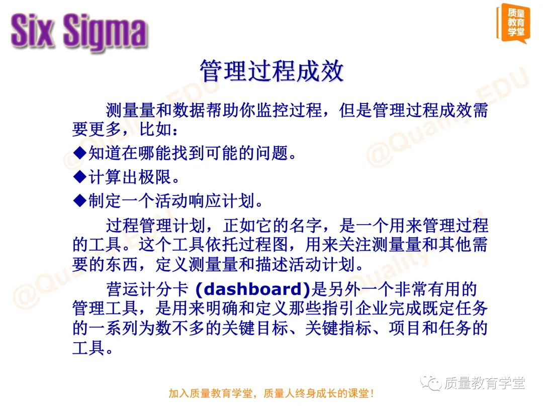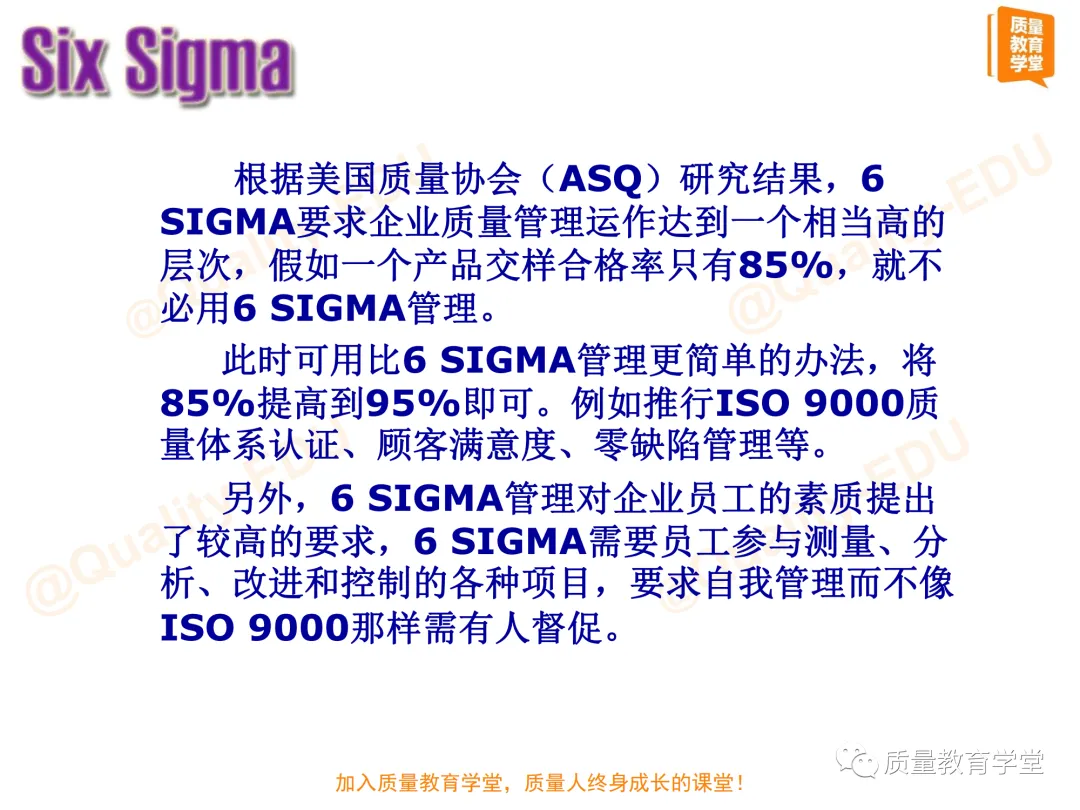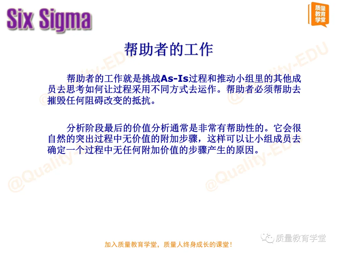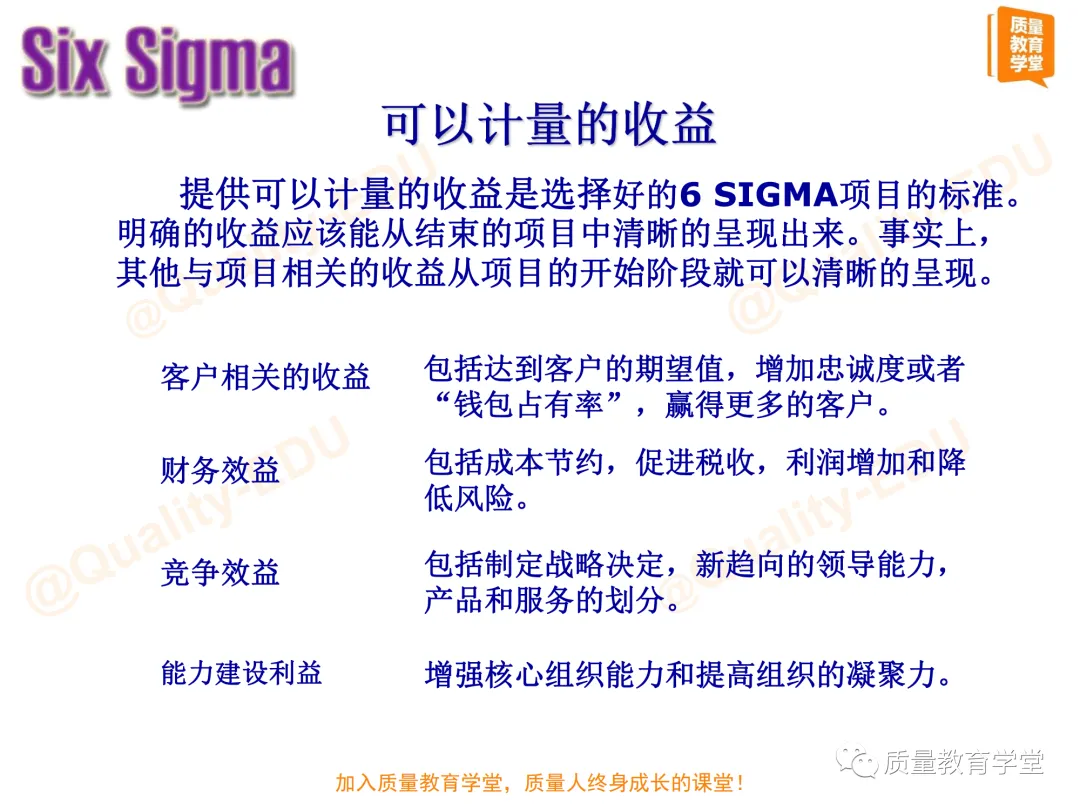 六西格玛以倡导者,大黑带,黑带,绿带体系建立人力资源构架,为企业培养了具备组织能力,激励能力,项目管理技术和数理统计诊断能力的领导者,这些人才是企业适应变革和竞争的核心力量。以保证公司内部持续性。