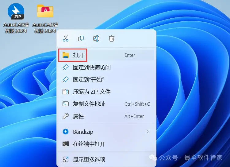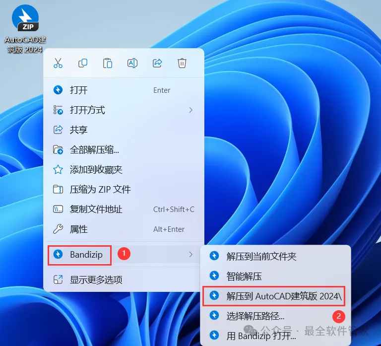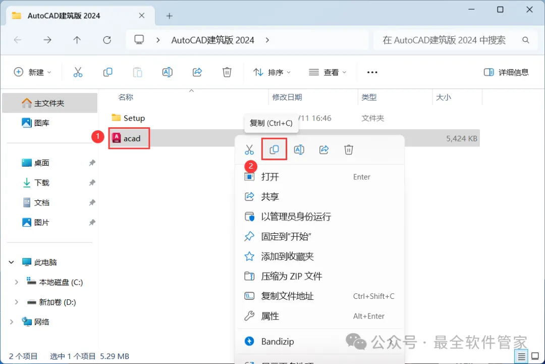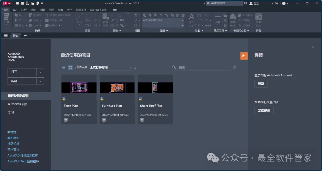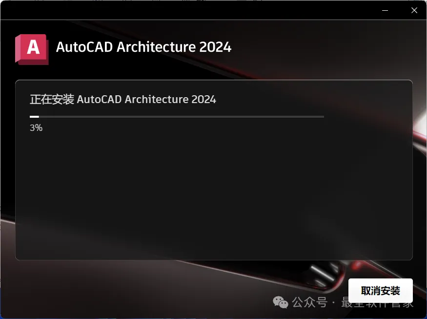 AutoCAD建筑版 2024软件安装包及详细安装教程软件简介AutoCAD建筑版 2024是美国Autodesk公司面向专业的建筑师打造的一款简化建筑设计和绘图软件,AutoCAD建筑版最大的不同是该软件的重心是建筑建制图,新版支持更快速地设计并实施改造,自动为工程图中的每个房间添加带有房间面积的标签,重在更新贴心设计功能。安装需知[软件名称]:AutoCAD建筑版 2024[软件大小]:3.00G[软件语言]:中文简体[安装环境]:Win10及以上版本[下载地址]:公众号内回复:CAD建筑版[不限速下载]:免费获取百度网盘不限速下载工具。公众号内回复:不限速[注意事项]:安装前请关闭网络、杀毒软件和防火墙,否则易安装失败。公众号内回复:1[解压软件]:小编用的解压软件是Bandizip,获取Bandizip软件安装包。公众号内回复:2安装教程1、下载AutoCAD建筑版 2024软件安装包到电脑上,右键选择【解压到AutoCAD建筑版 2024\】2、右键【打开】解压后的文件夹 3、找到【Setup】文件夹,右键【打开】它4、找到【Setup】应用程序,右键选择【以管理员身份运行】它 5、勾选【我同意】,再点击【下一步】6、软件默认安装在C盘,可自定义更改软件安装位置,这里小编选择安装在D盘;点击【安装】 7、软件安装中,稍等片刻8、软件安装成功,点击右上角【关闭按钮】 9、回到AutoCAD建筑版 2024文件夹,找到【acad】文件,再右键点击【复制按钮】10、回到桌面,右键桌面上的【AutoCAD Architecture 2024软件图标】,点击【打开文件所在的位置】 11、右键文件夹的空白处,点击【粘贴按钮】12、点击【替换目标中的文件】 13、回到桌面,右键桌面上的【AutoCAD Architecture 2024软件图标】,点击【打开】14、软件正在打开,启动界面如下: 15、软件打开成功,运行界面如下:16、以上就是AutoCAD建筑版 2024软件安装的全过程,要是对你有帮助的话,请为小编点个赞! 免责声明:软件资源均来源于网络,仅供用户交流学习与研究使用,版权归属原版权方所有,版权争议与本公众号无关,用户本人下载后不能用作商业或非法用途,否则后果均由用户承担责任;如果您访问和下载此文件,表示您同意只将此软件用于参考、学习而非其他用途,否则一切后果请您自行承担,请于下载后24小时内删除,不允许用于商业用途,否则法律问题自行承担。如果您喜欢该软件,请支持正版软件,购买注册,得到更好的正版服务。
