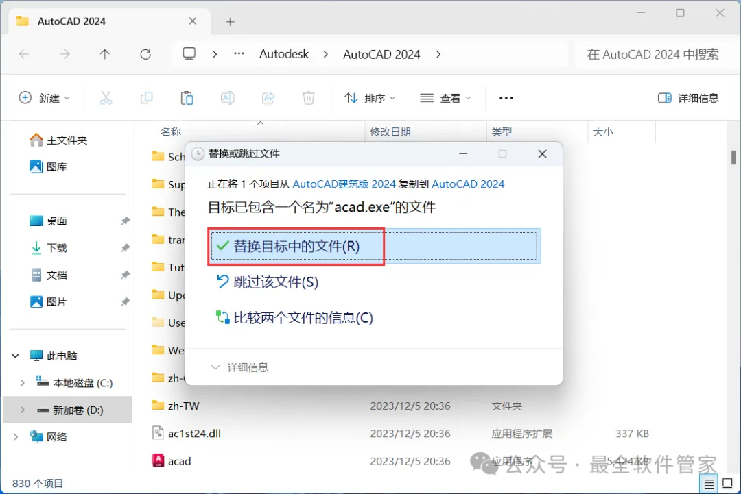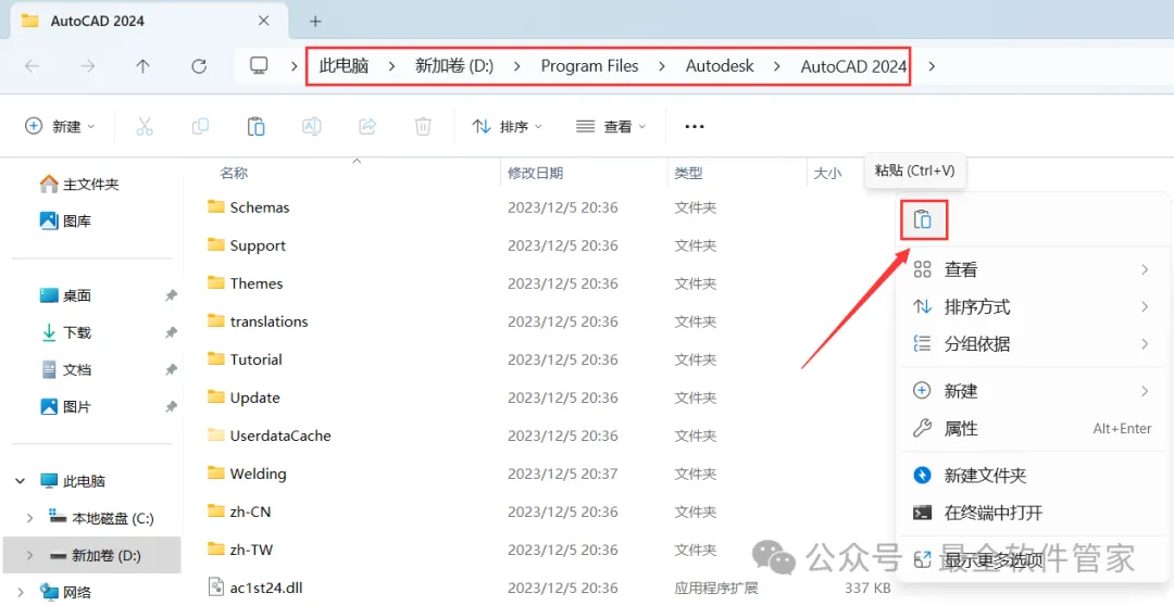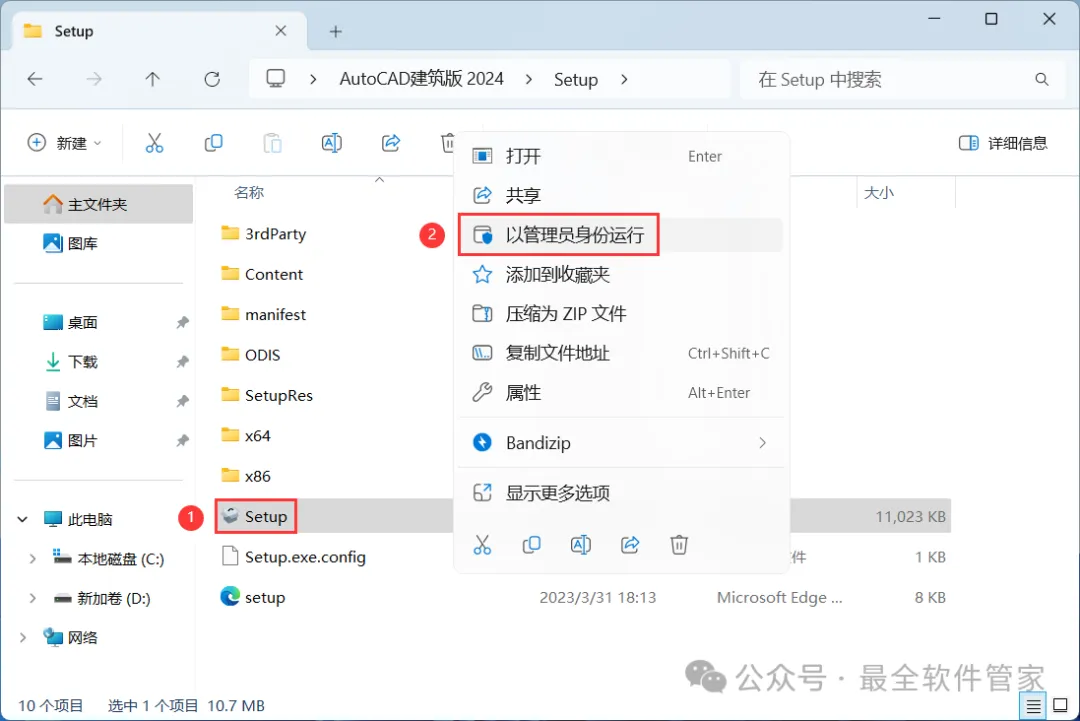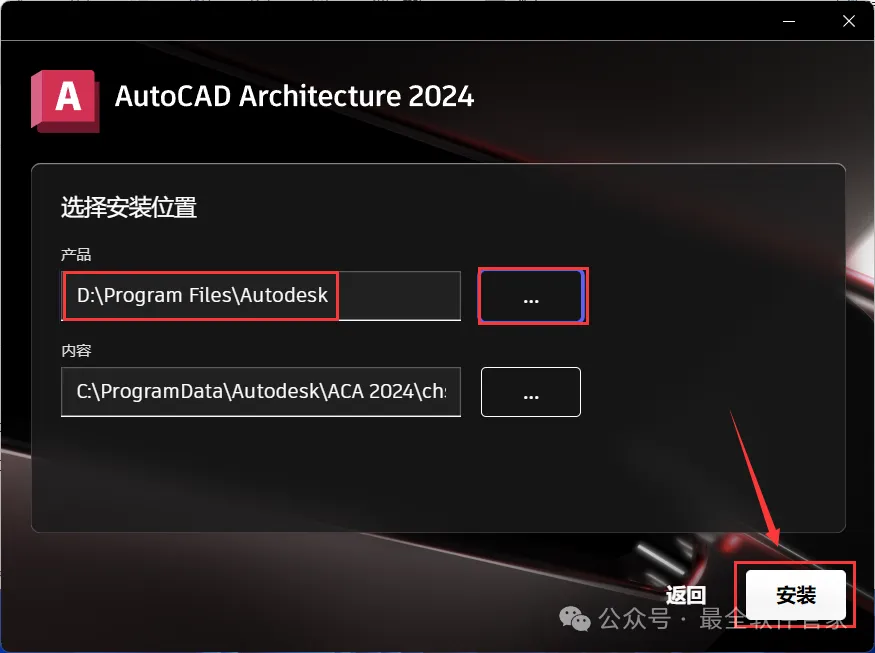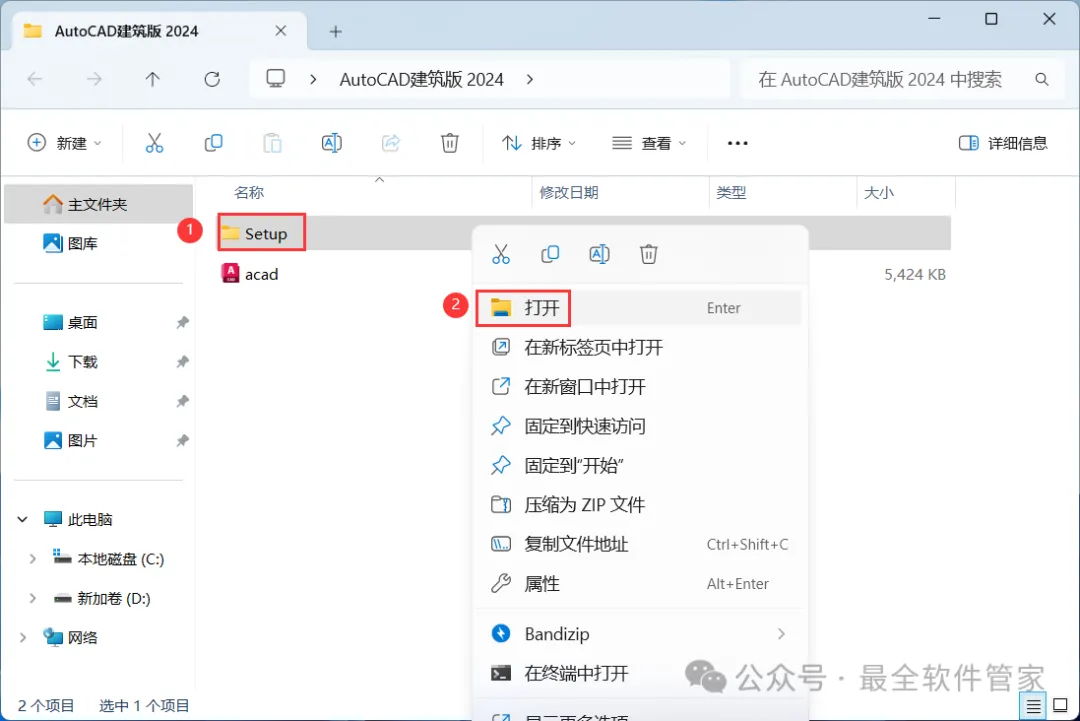 AutoCAD建筑版 2024软件安装包及详细安装教程软件简介AutoCAD建筑版 2024是美国Autodesk公司面向专业的建筑师打造的一款简化建筑设计和绘图软件,AutoCAD建筑版最大的不同是该软件的重心是建筑建制图,新版支持更快速地设计并实施改造,自动为工程图中的每个房间添加带有房间面积的标签,重在更新贴心设计功能。安装需知[软件名称]:AutoCAD建筑版 2024[软件大小]:3.00G[软件语言]:中文简体[安装环境]:Win10及以上版本[下载地址]:公众号内回复:CAD建筑版[不限速下载]:免费获取百度网盘不限速下载工具。公众号内回复:不限速[注意事项]:安装前请关闭网络、杀毒软件和防火墙,否则易安装失败。公众号内回复:1[解压软件]:小编用的解压软件是Bandizip,获取Bandizip软件安装包。公众号内回复:2安装教程1、下载AutoCAD建筑版 2024软件安装包到电脑上,右键选择【解压到AutoCAD建筑版 2024\】2、右键【打开】解压后的文件夹 3、找到【Setup】文件夹,右键【打开】它4、找到【Setup】应用程序,右键选择【以管理员身份运行】它 5、勾选【我同意】,再点击【下一步】6、软件默认安装在C盘,可自定义更改软件安装位置,这里小编选择安装在D盘;点击【安装】 7、软件安装中,稍等片刻8、软件安装成功,点击右上角【关闭按钮】 9、回到AutoCAD建筑版 2024文件夹,找到【acad】文件,再右键点击【复制按钮】10、回到桌面,右键桌面上的【AutoCAD Architecture 2024软件图标】,点击【打开文件所在的位置】 11、右键文件夹的空白处,点击【粘贴按钮】12、点击【替换目标中的文件】 13、回到桌面,右键桌面上的【AutoCAD Architecture 2024软件图标】,点击【打开】14、软件正在打开,启动界面如下: 15、软件打开成功,运行界面如下:16、以上就是AutoCAD建筑版 2024软件安装的全过程,要是对你有帮助的话,请为小编点个赞! 免责声明:软件资源均来源于网络,仅供用户交流学习与研究使用,版权归属原版权方所有,版权争议与本公众号无关,用户本人下载后不能用作商业或非法用途,否则后果均由用户承担责任;如果您访问和下载此文件,表示您同意只将此软件用于参考、学习而非其他用途,否则一切后果请您自行承担,请于下载后24小时内删除,不允许用于商业用途,否则法律问题自行承担。如果您喜欢该软件,请支持正版软件,购买注册,得到更好的正版服务。
