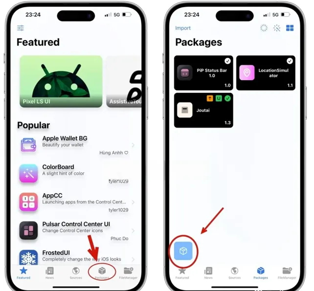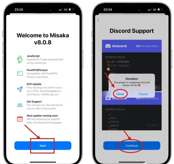 3. 漏洞注入全程保持科学上网,打开 misaka。依次点击 Next -> close -> continue。 点击 misaka 右下角第二个 Packages,点击左下角的盒子图标。 依次点击 Install TrollStore -> Tips。 出现是否点击 ok 的界面时,千万不要点 ok !直接同时按着音量➕和关机键,滑动关机即可!
