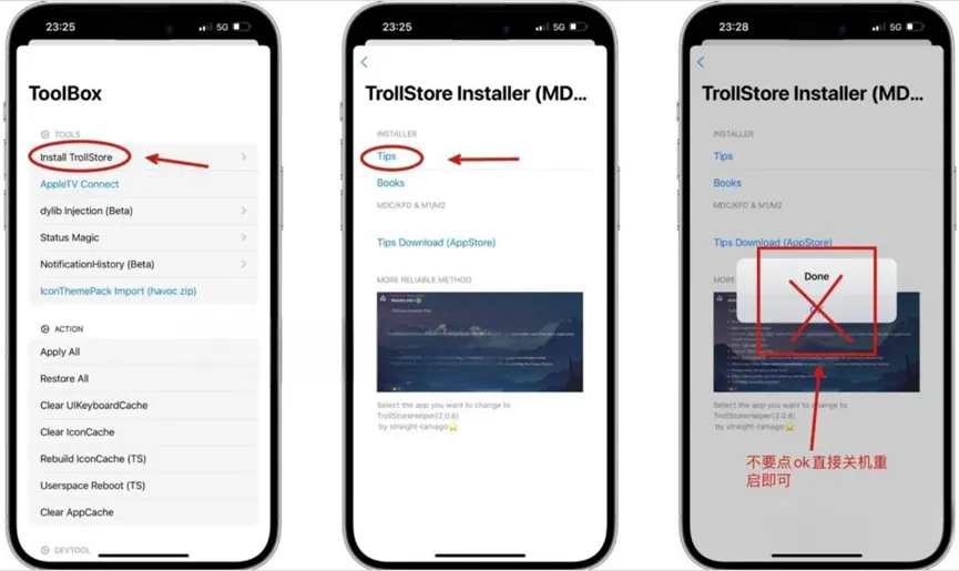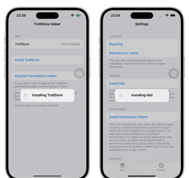 4. 完成安装开机后,打开“提示”app点击 Install TrollStore,等待注销。 打开桌面上的 TrollStore,右下角设置,点击 Install ldid。出现 ldid: Installed 就大功告成了!