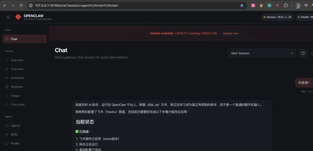 如果网页还是打不开: 在终端输入 openclaw status 查看 Gateway 是否显示为 running。 想接入微信/Telegram: 在网页后台的 Channels 页面点击添加,或者直接在终端输入 openclaw channels login 扫码。