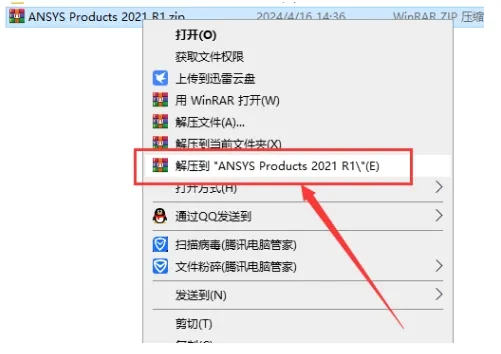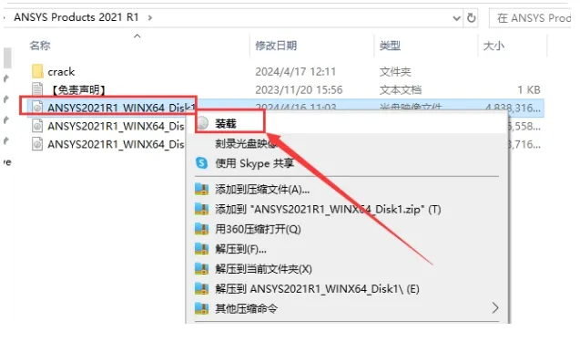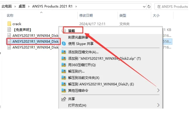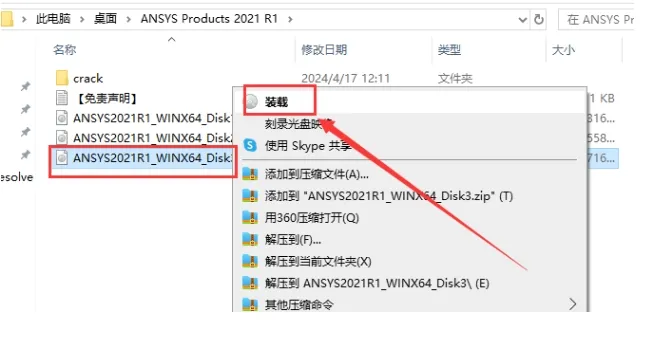 2. 右键点击 `ANSYS2021R1_WINX64_Disk1.iso`,装载或解压。