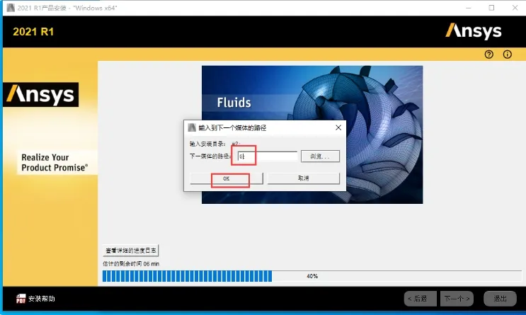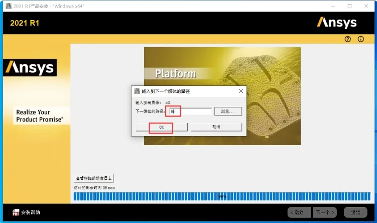 17. 当安装进度到99%时,弹出对话框,将路径更改为刚才装载的路径,点击“OK”继续安装。