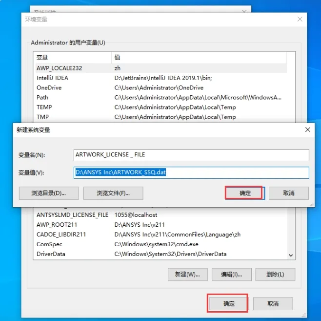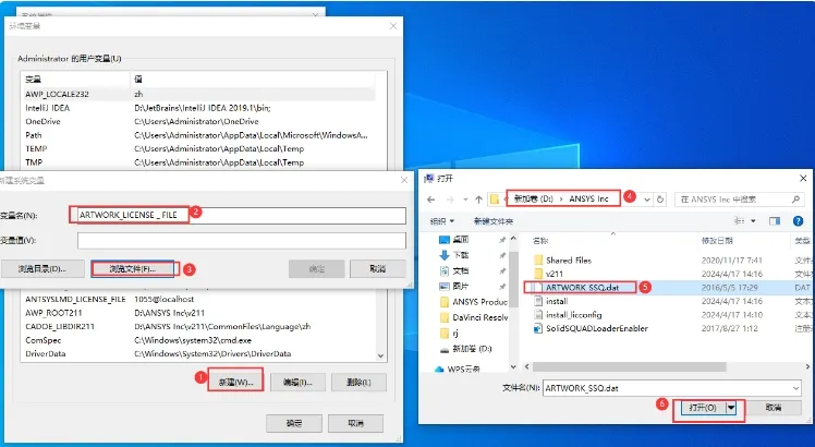 25. 新建环境变量,输入【ARTWORK_LICENSE_FILE】,点击【浏览】,找到安装目录下的 `ARTWORK ssQ.dat` 文件并打开。