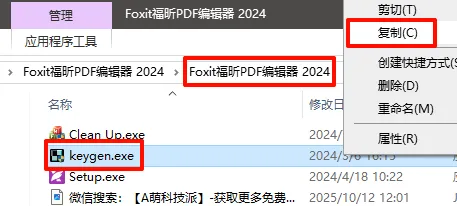 8.返回到解压的【Foxit福昕PDF编辑器 2024】文件夹中,鼠标右击【keygen】注册机选择【复制】。