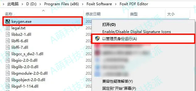 11.在文件夹中找到粘贴的【keygen】注册机,选择【以管理员身份运行】。