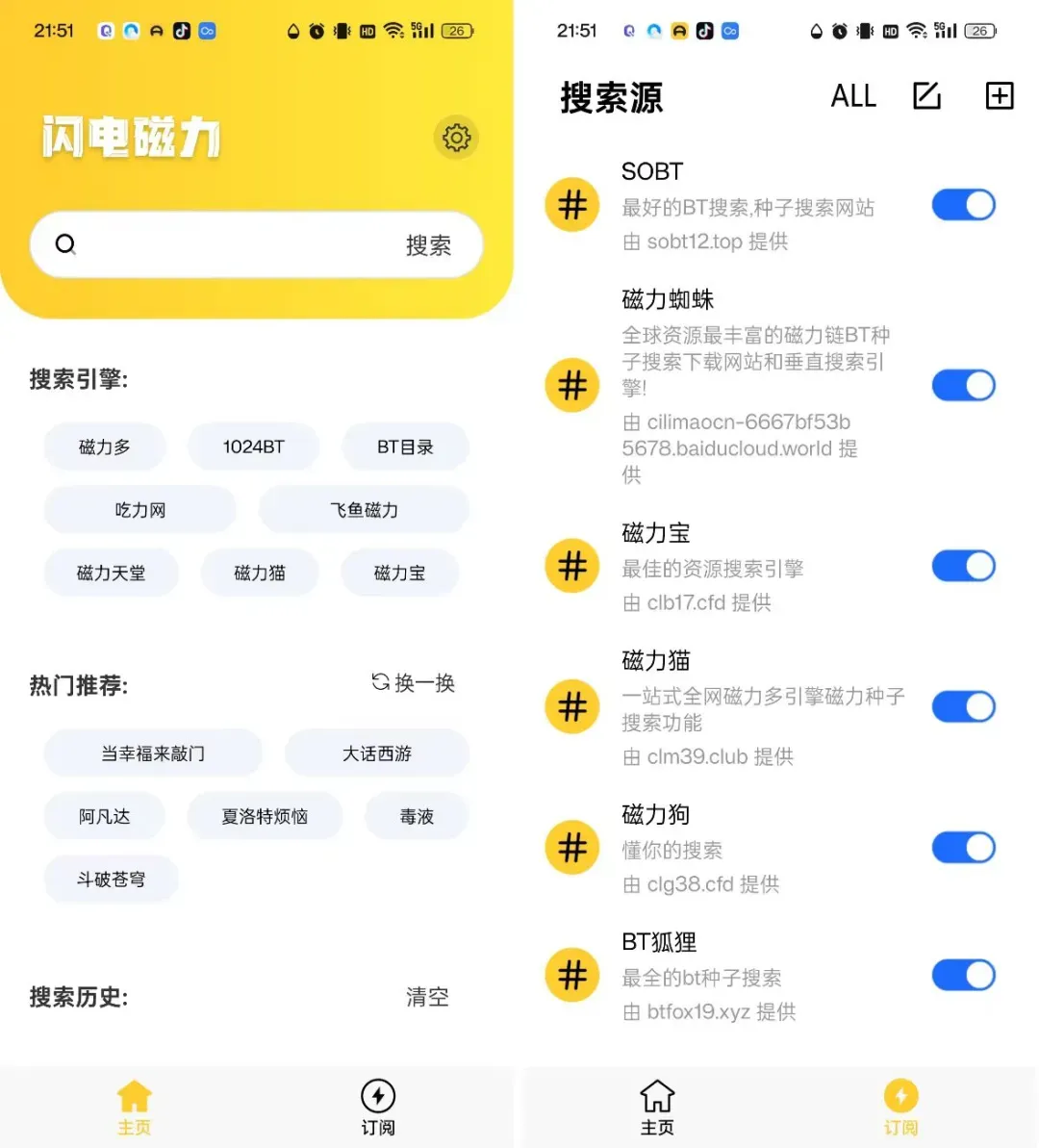 废话不多说,这款C力搜索器最强大的地方就在于:通过订阅接口来访问不同的网络资源文件。它能够助你轻松检索各种文件、视频资料,并提供多个搜索引擎,搜出来的资源不喜欢可以切换其他引擎