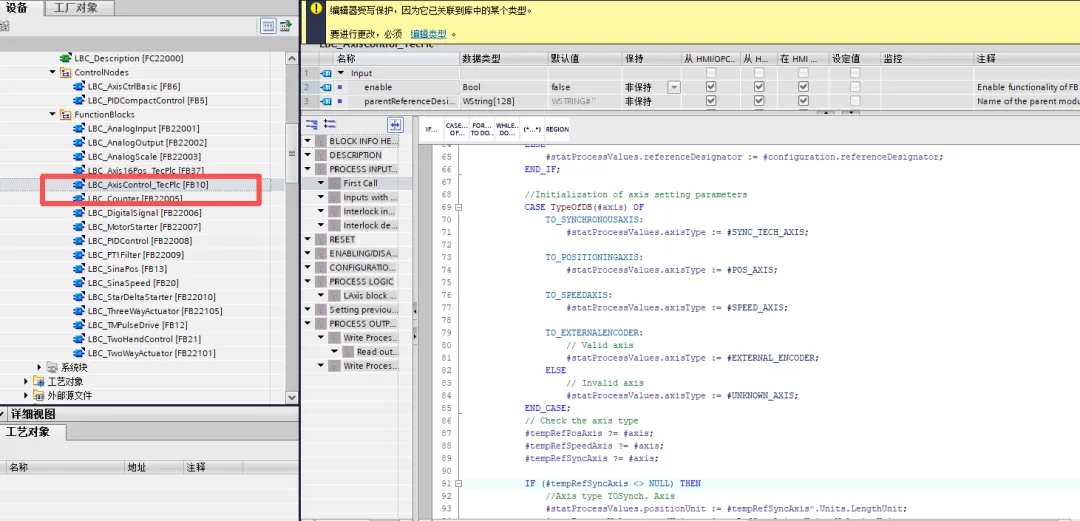 LBC_AxisControl_StdPlc/LBC_AxisControl_TecPlc:功能强大的轴控制块,支持点位、速度、同步轴等多种模式,包含点动、回零、相对/绝对定位、齿轮同步、凸轮等功能。LBC_Axis16Pos_StdPlc/LBC_Axis16Pos_TecPlc:支持16个预设位置的点位控制,适用于多工位应用。LBC_AxisCtrlBasic:轻量级轴控制块,专为S7-1200 G2设计,实现基本运动控制。LBC_SinaPos/LBC_SinaSpeed:通过标准报文与SINAMICS驱动器通信,实现定位或速度控制。电机启动器