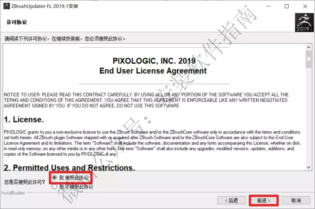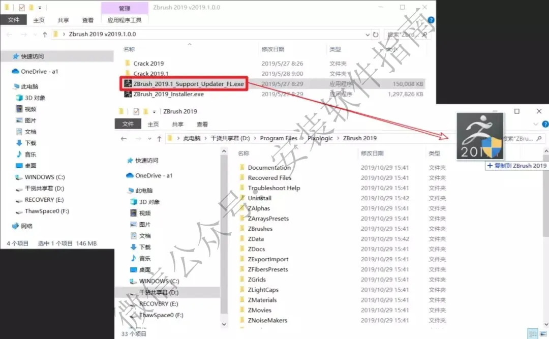 11.刚才我们安装的是2019.0版本,现在可以更新到2019.1版本,将ZBrush_2019.1_Support_Updater_FL.exe文件复制到第6步选择的安装目录并双击进行更新