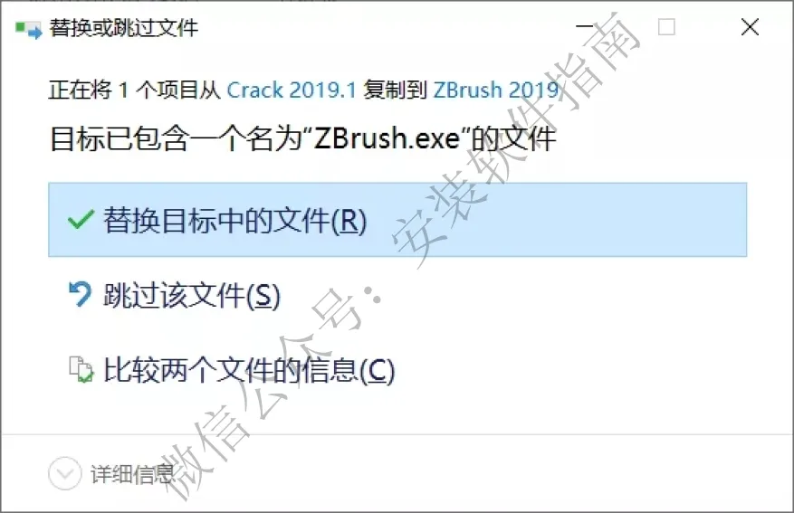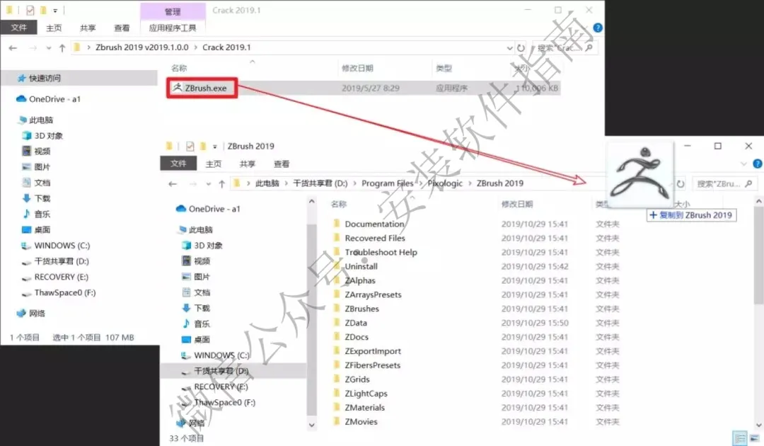 18.将Crack 2019.1里面的激活补丁复制粘贴到我们第6步选择的安装目录即D:\Program Files\Pixologic\ZBrush 2019(如果你不安装更新补丁,则用Crack 2019里面的激活补丁来替换源文件)