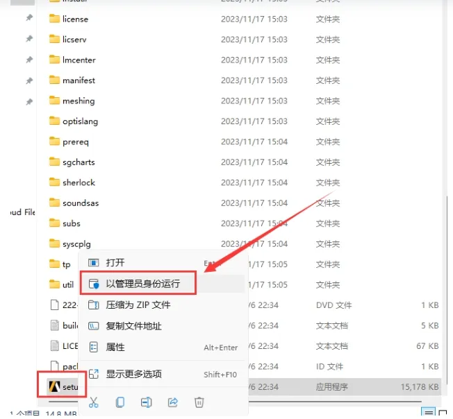 找到`setup`安装程序,右键点击并选择“以管理员身份运行”。