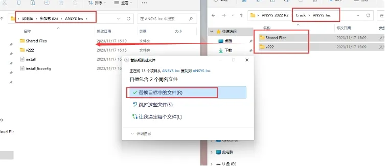打开安装目录(根据步骤6更改的位置),进入安装包中的`Crack-ANSYS Inc`文件夹,将破解文件复制到安装目录并替换。