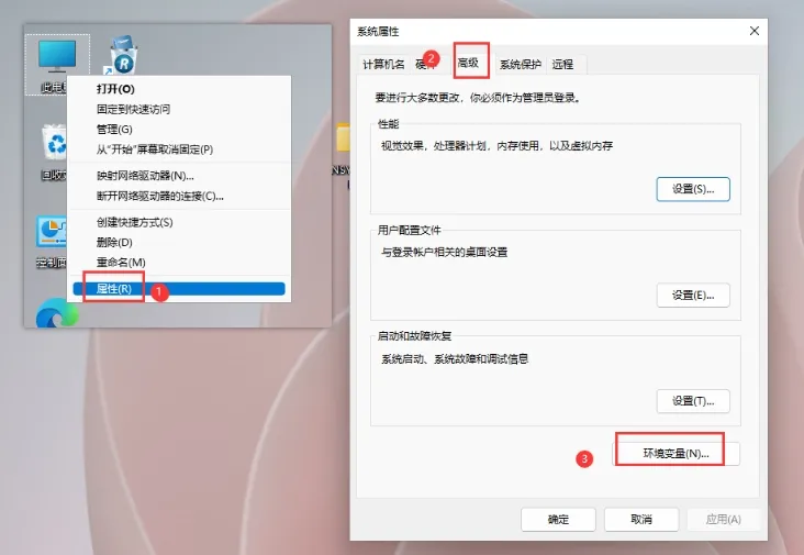 右键点击【此电脑】选择【属性】 > 【高级系统设置】,进入系统属性后点击【环境变量】。