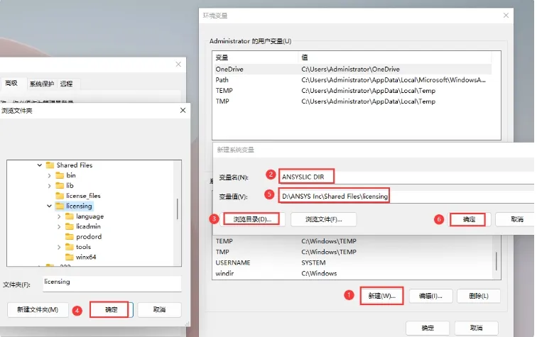 在环境变量中点击【新建】,设置变量名为`ANSTYSLIC_DIR`,变量值为安装目录中的`licensing`文件夹路径。