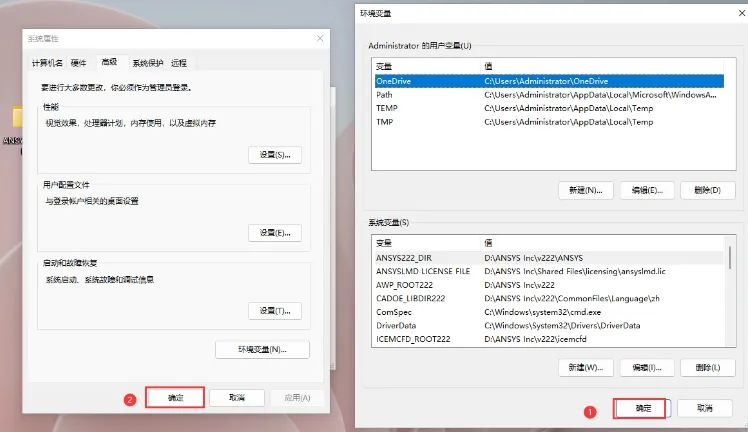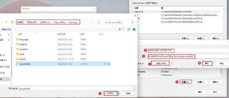 再次点击【新建】并设置变量名为`ANSYSLMD_LICENSE_FILE`,变量值为安装目录中的`licensing`文件夹下的`ansyslmd.lic`文件路径。