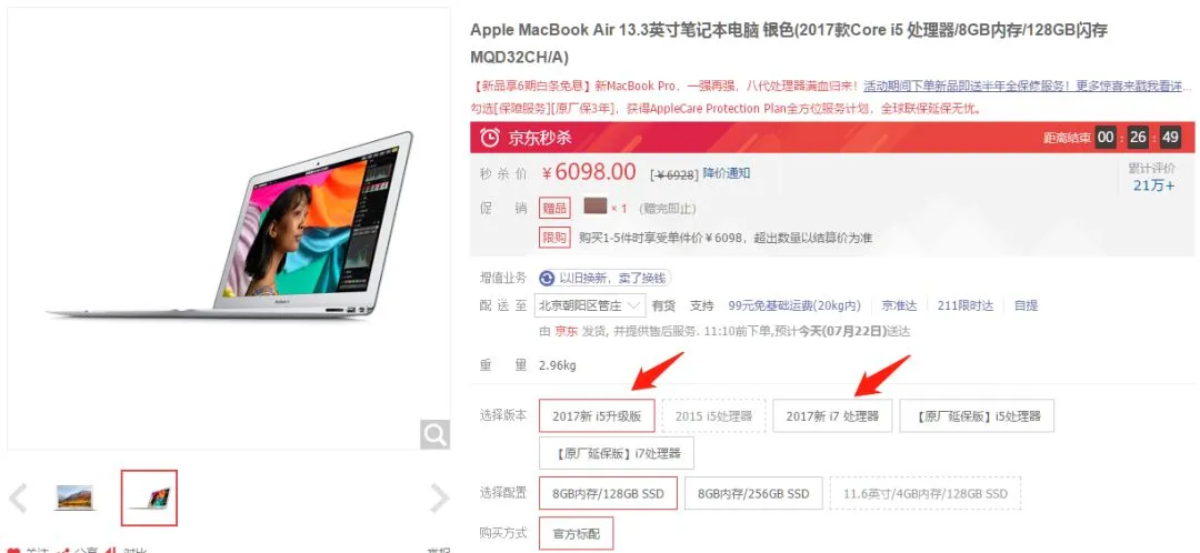 在京东的销售页面上,我们可以看到它明确标出了这款电脑是【2017升级版】、【2017新i7处理器】,这两个描述具有非常强烈的误导性。