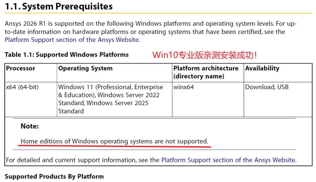 1、这个新版本的ANSYS应该是配合windows的最新版本吧,现在是不支持windows7系统了,而且仍然是不支持家庭版系统,可能有小伙伴的win10或win11家庭版可以安装成功新版本ANSYS,我想这应该是极少数。从ANSYS官方的安装提示文件里可以看到如下一段。