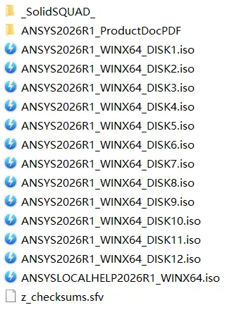 获取ANSYS2026R1下载链接后,可使用百度网盘进行下载。下载完的文件如下图所示。(_SolidSQUAD_为破解替换文件)。