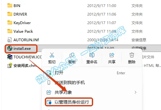 3.在打开的文件夹,找到并选中【install.exe】,鼠标右键选择【以管理员身份运行】