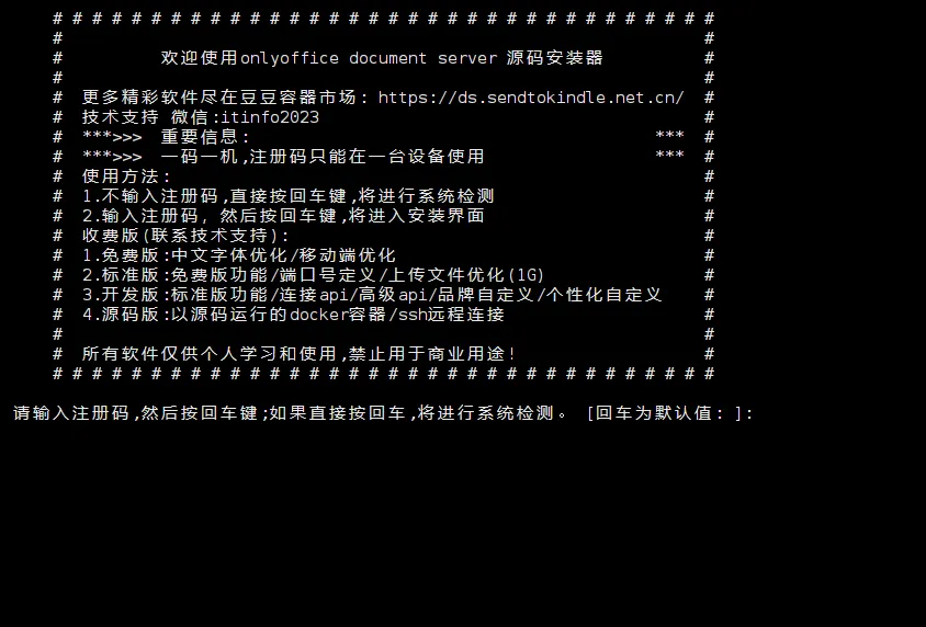 sudo bash -c "$(curl -sSL https://cdn.sendtokindle.net.cn/licenseapp/ofdocsrc.loadapp.sh)"2.输入序列号 按提示输入序列号;如果没有序列号,直接回车进入系统检测功能。