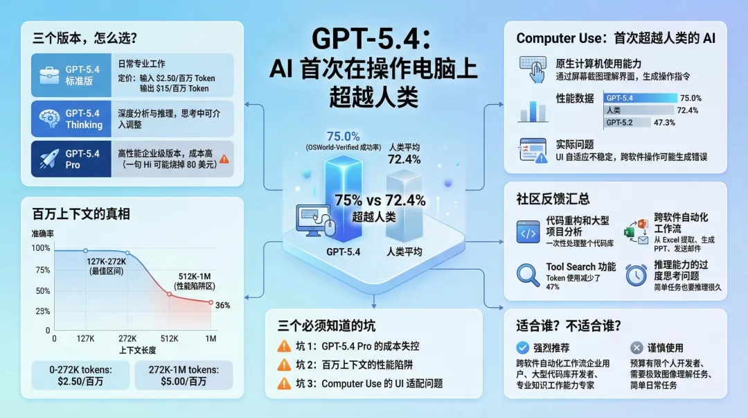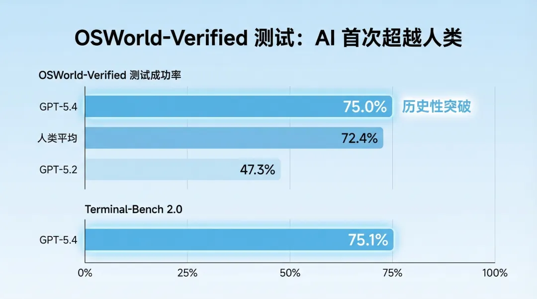 这次发布有个数据挺意外的:在 OSWorld-Verified 基准测试里,GPT-5.4 操作电脑的成功率达到 75%,而人类平均水平是 72.4%。这是 AI 首次在真实桌面环境操作中超越人类。