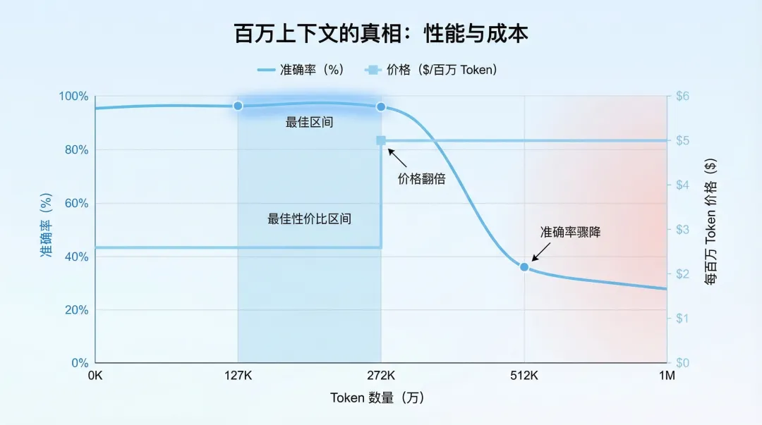 知乎上有用户评价:百万上下文听起来很美,但超过 272K 后价格翻倍,而且准确率在 512K 以上会骤降至 36%。能用不等于好用,实际最佳区间只有 127K-272K。