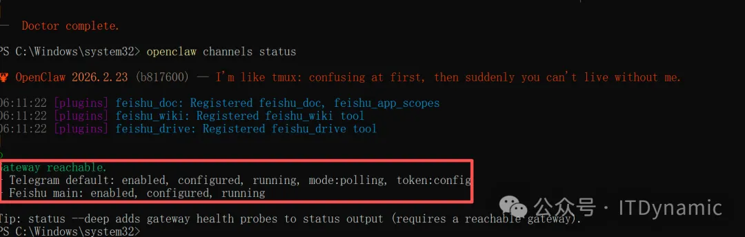 # 查看服务状态openclaw gateway status# 手动启动openclaw gateway --port 18789# 重启服务openclaw gateway restart验证安装