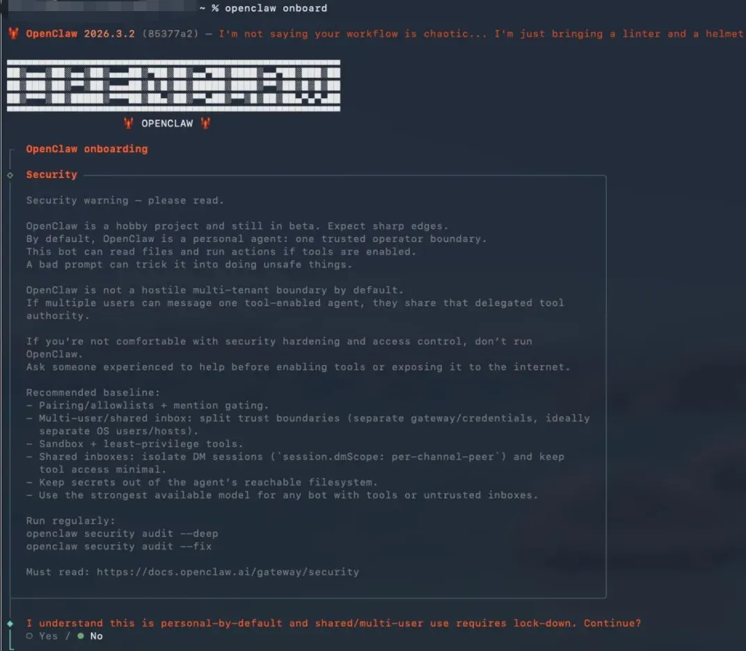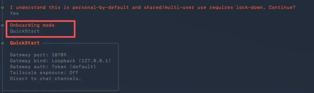 OpenClaw 会先问你使用场景,更准确地说,它是在确认你是个人使用,还是打算给多人共享。如果只是自己本地体验、开发和测试,直接选默认方案就可以;只有在团队共用、多人访问同一个实例时,才需要把权限和安全限制收紧。