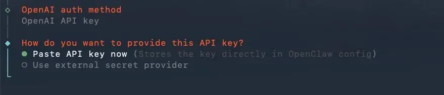 1. 选择 API Key认证方式2. 在终端中粘贴你的 OpenAI API Key 3. 回车确认