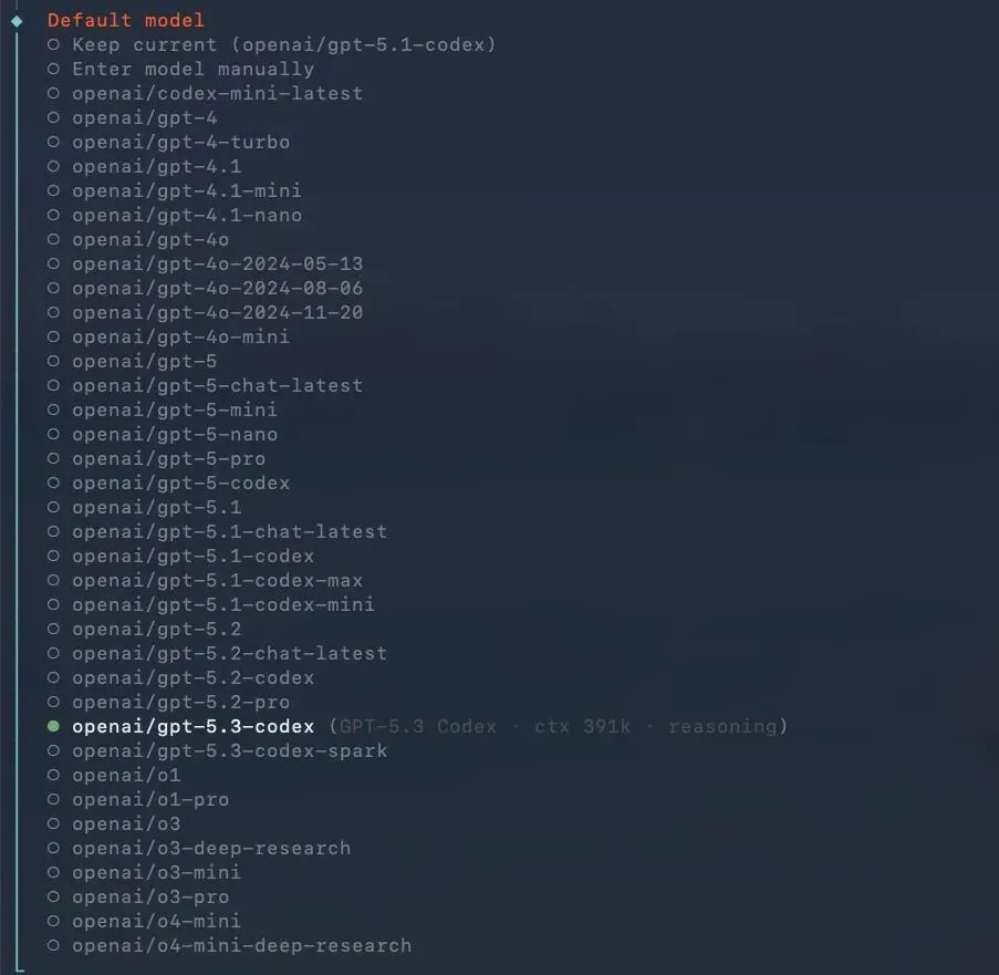 gpt-5.3-codex为什么不直接选 GPT-5.4?因为当前 OpenClaw 的初始化引导里还没有把它作为默认候选项展示出来。也正因为如此,我们才需要在完成初始化后,再手动把默认模型改成 openai-codex/gpt-5.4。