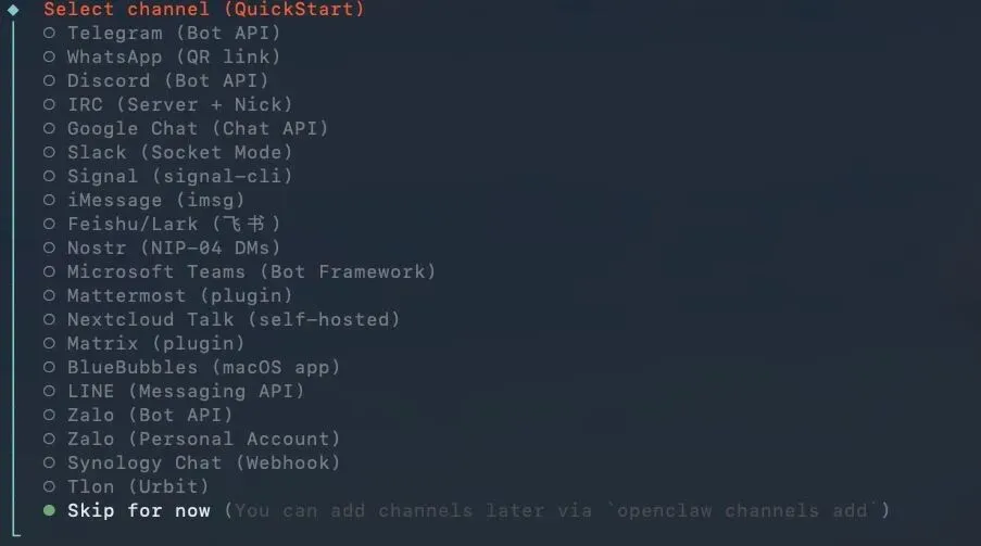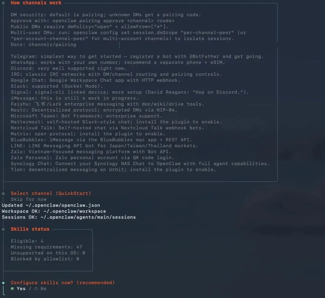 后面如果系统问你是否配置飞书等消息通知渠道,可以先跳过。