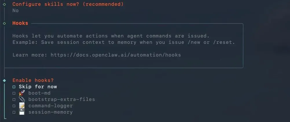 然后系统可能会继续询问要不要配置 Skill。这里同样可以先跳过。
